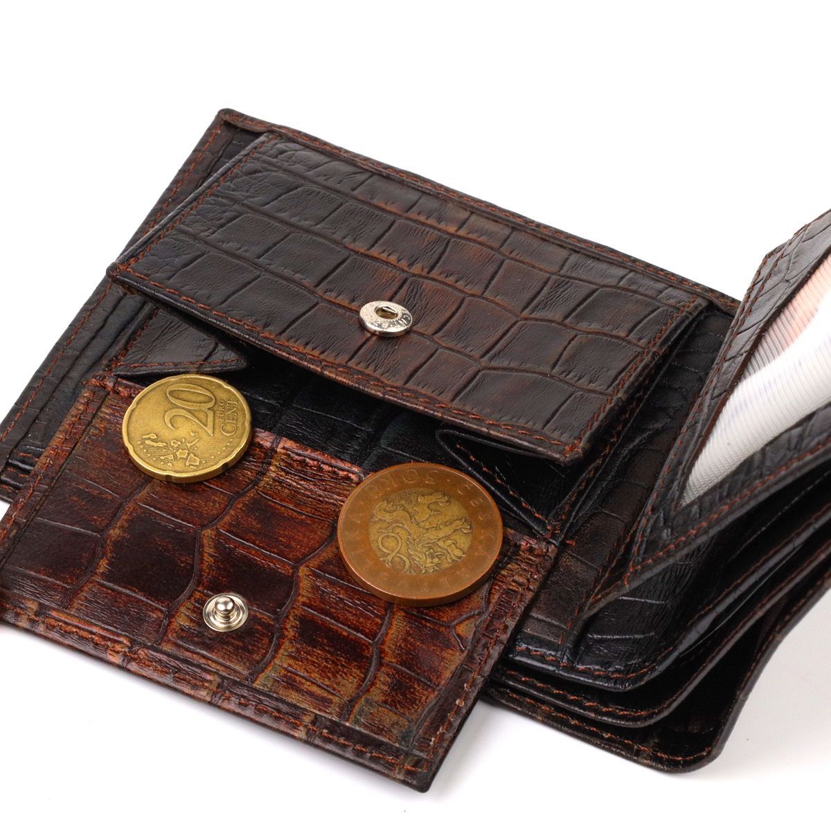 Вместительный и мужской кошелек в необычном коричневом цвете из натуральной кожи, с тиснением под крокодила. Аксессуар имеет одно основное отделение с перегородкой, в которое помещаются купюры всех номиналов, четыре кармана для карточек, два кармана под сеточкой для документов, монетницу и три близлежащих кармана. Закрывается аксессуар пополам без застежки. Упакованный бумажник картонную коробку. Кожаный кошелек является отличным подарком для родных и близких людей.