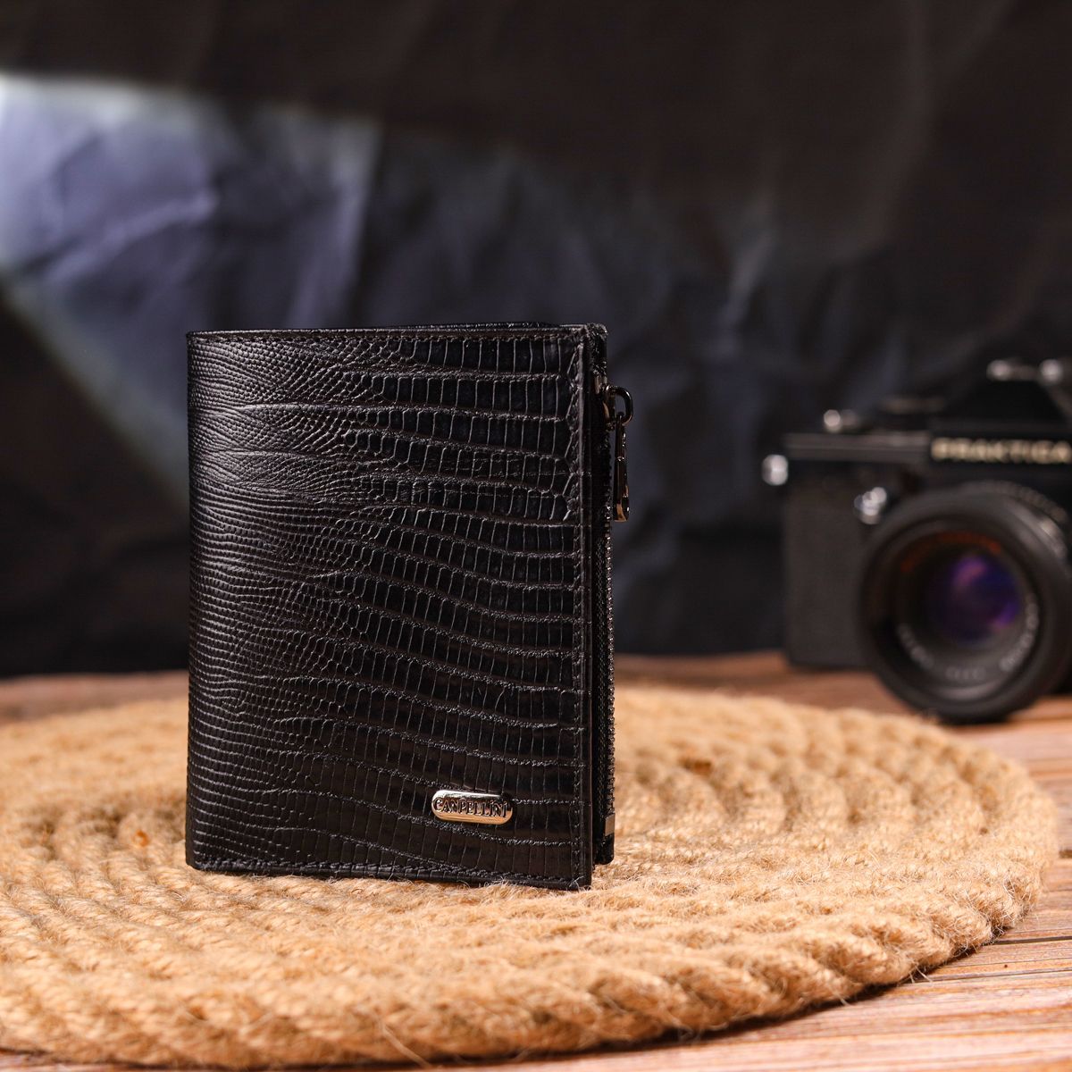 Стильный кошелек унисекс компактного размера из натуральной кожи, с тиснением под рептилию. Аксессуар имеет отделение для купюр, монетницу, закрывающуюся на молнию, два скрытых кармана и десять ячеек для карточек, один под сеточкой. Закрывается аксессуар в два добавления на кнопку. Качественный кожаный аксессуар всегда считался показателем вкуса и изобилия, именно такие изделия представлены в нашем магазине, у нас каждый найдет что-нибудь для себя.