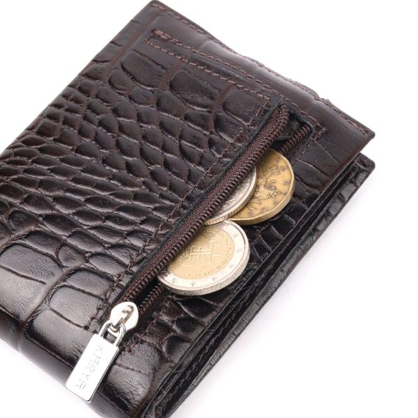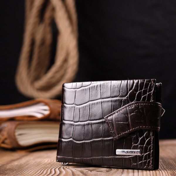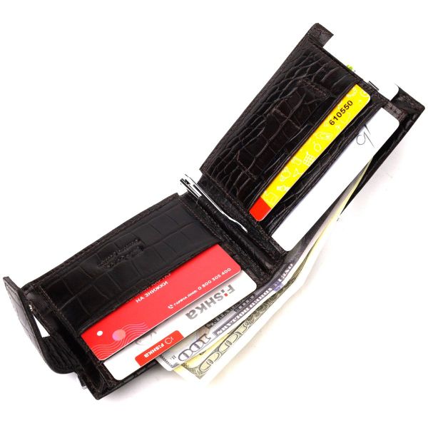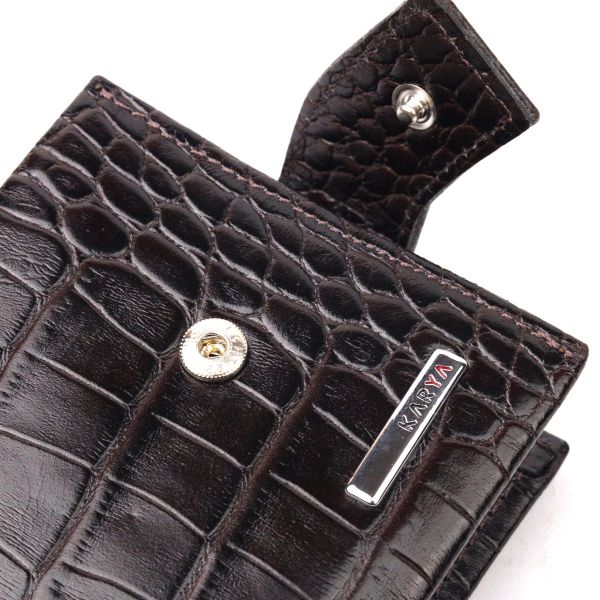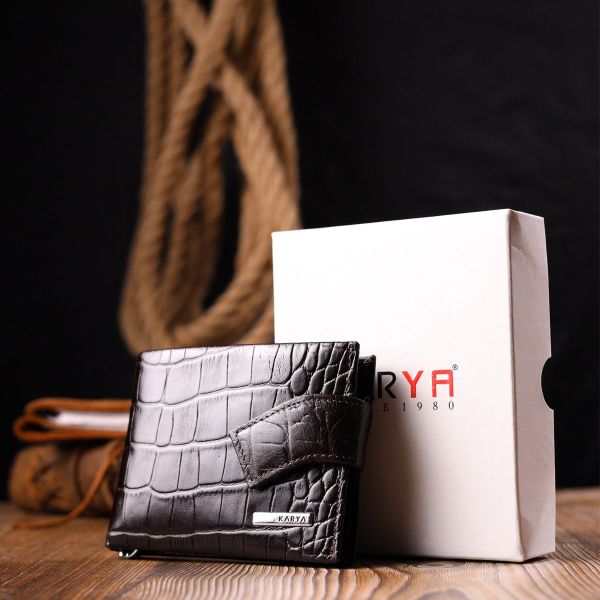 Функциональный мужской зажим из натуральной лакированной фактурной кожи под крокодила KARYA 21044 коричневый