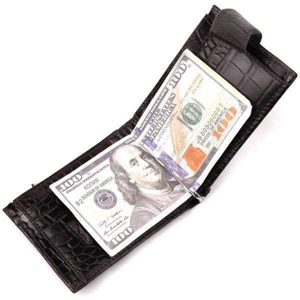Удобный зажим для купюр выполнен из добротной натуральной кожи, с тиснением под крокодила, коричневого цвета. Купюры фиксируются металлическим держателем. Польза зажима заключается в том, что он гораздо компактнее, чем кошелек, легко помещается в руку или карман. Кроме того, аксессуар надежнее и безопаснее закрепляет деньги, поэтому лучше выбрать его. Аксессуар упакован в фирменную коробочку. Изделия из натуральной кожи всегда будут отличным подарком для близкого человека.