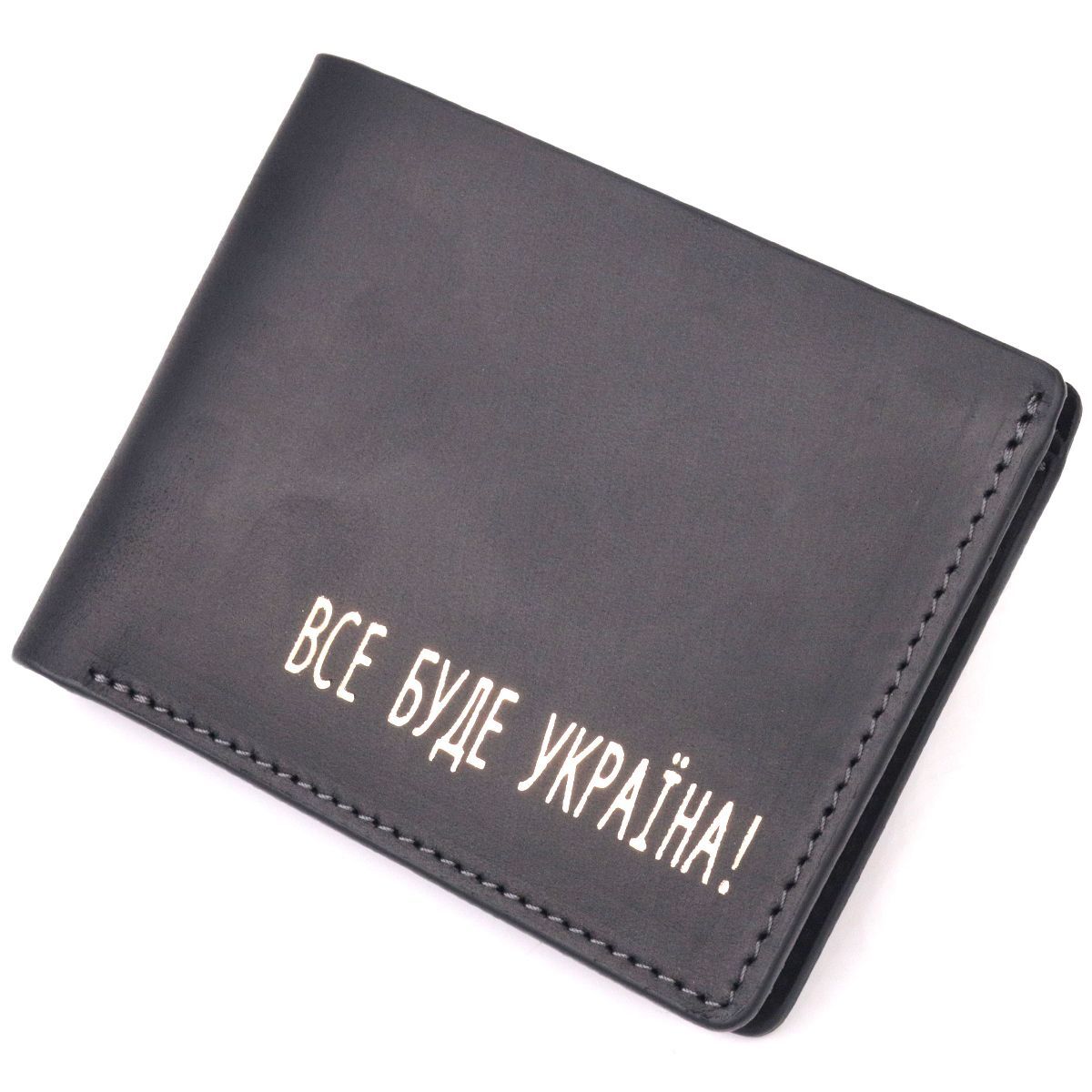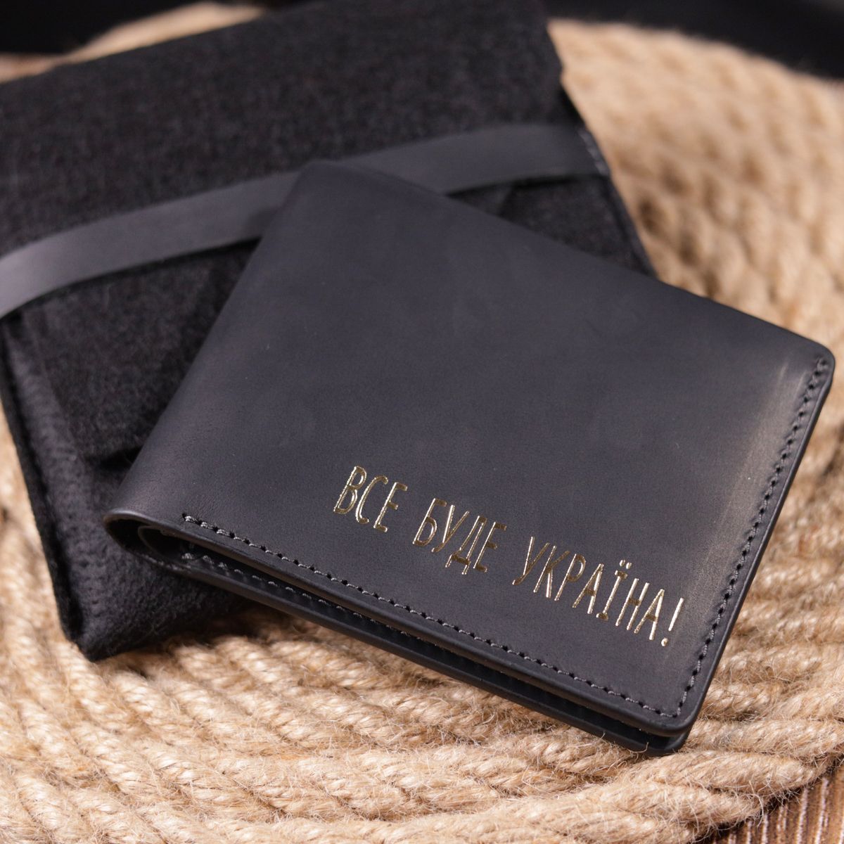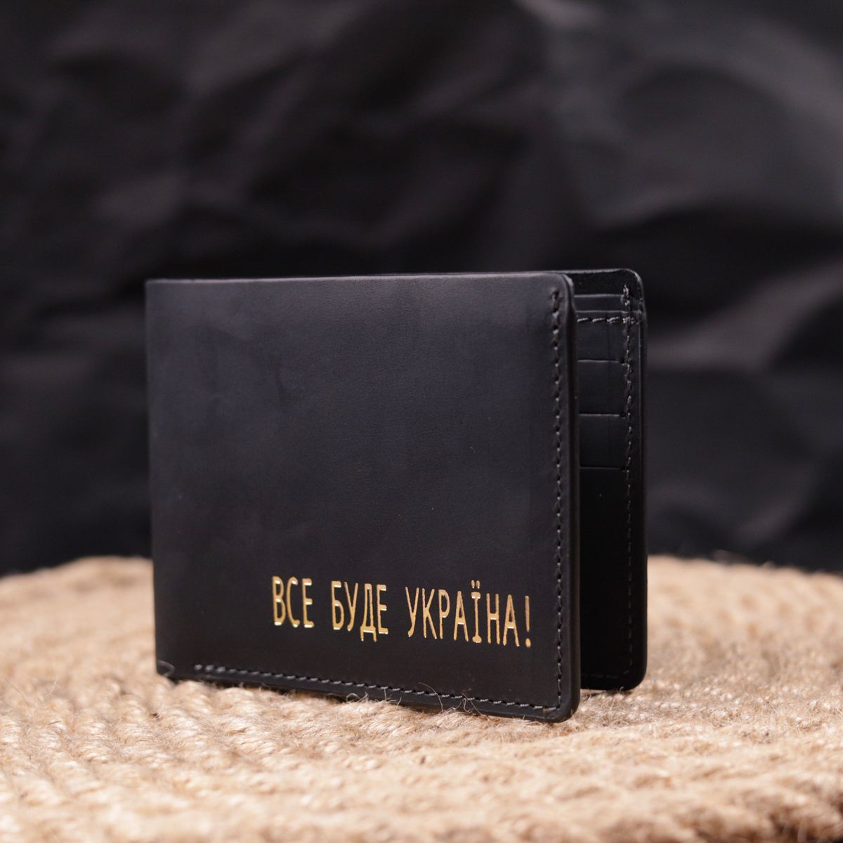 Многофункциональный кожаный кошелек черного цвета с патриотической надписью "Все будет Украина". Изделие сшито из качественной винтажной кожи, с высокими показателями износостойкости. Портмоне имеет одно большое отделение для купюр всех номиналов, а также достаточное количество отделений для карт, без застежки. Такой кошелек станет отличным подарком для родных и близких.
