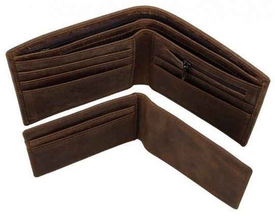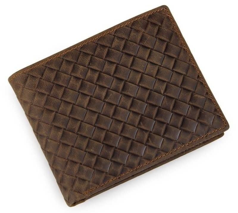 Отличный мужской кошелек из натуральной натуральной кожи. Внешняя сторона аксессуара украшена тесным декоративным рисунком. Цвет фурнитуры латунь. Кошелек аккуратно прошит светло-коричневой нитью. Кошелек упакован в текстильный чехол белого цвета.