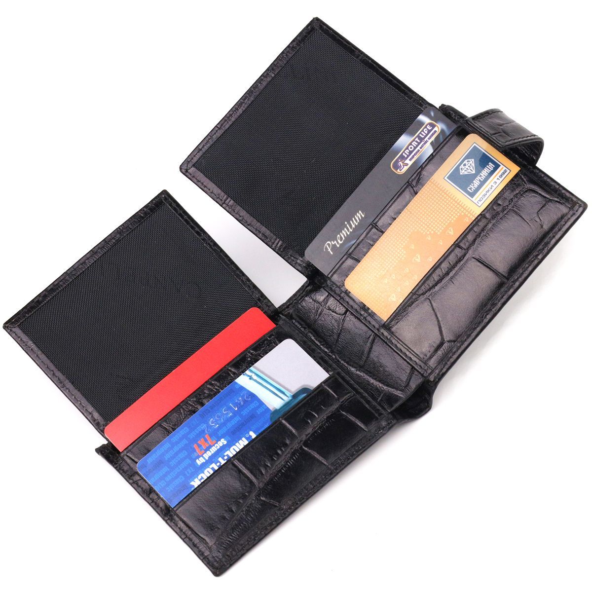 Практичный мужской портмоне из натуральной фактурной кожи с тиснением под крокодила в насыщенном черном цвете. Аксессуар имеет одно основное отделение с перегородкой, в котором размещаются купюры всех номиналов, двенадцать карманов для карточек, четыре из которых под сеточкой. Закрывается аксессуар хлястиком на кнопку. Цвет фурнитуры – серебро. Вы легко сможете поместить его в карман брюк или маленькую сумку. Упакованный бумажник картонную коробку. Кожаный кошелек является отличным подарком для родных и близких людей.
