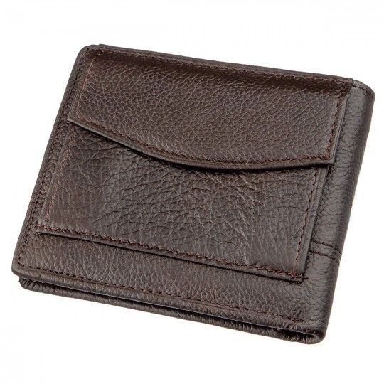 Класичний гаманець із натуральної шкіри темно-коричневого кольору. Аксесуар виконаний у зернистій шкірі. М'який та приємний на дотик і доповнений усім необхідним функціоналом. Аксесуар закривається кнопку. На зовнішньому боці металевий логотип бренду. Усередині гаманець доповнений просторими відділеннями для купюр, слотами для карток та відділення для купюр на блискавці. Портмоне закривається на хлястик із кнопкою. Легко поміститься у невелику сумку чи кишеню штанів. У комплекті йде картонна жовта коробка.