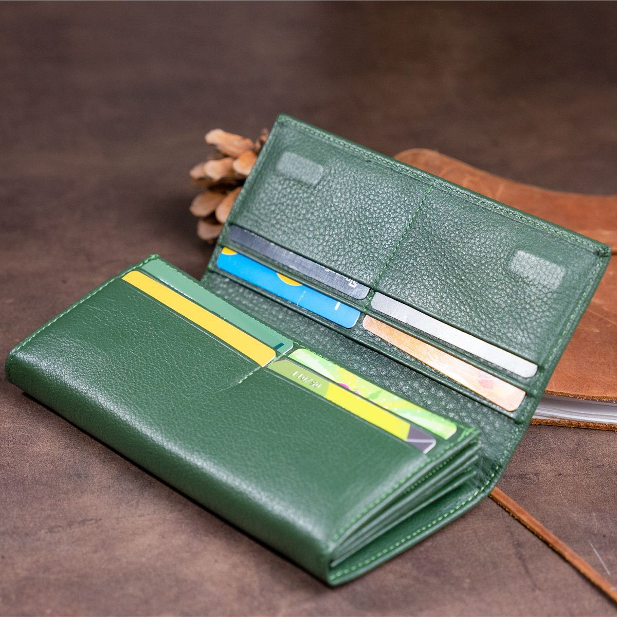 Кожаный женский кошелек в благородном зеленом цвете. Изделие имеет интересный и продуманный до мелочей дизайн. Зеленый цвет давно привлекает деньги. Поэтому наиболее благоприятный цвет для кошелька. Аксессуар включает в себя достаточно купюр, карточек. Модель не занимает много места в вашей сумочке. Аксессуар не оставит вас равнодушным. Легкий запах натуральной кожи, мягкая и эластичная структура материала. Модель проносится далеко не один год. В комплекте к кошельку идет фирменная упаковка.