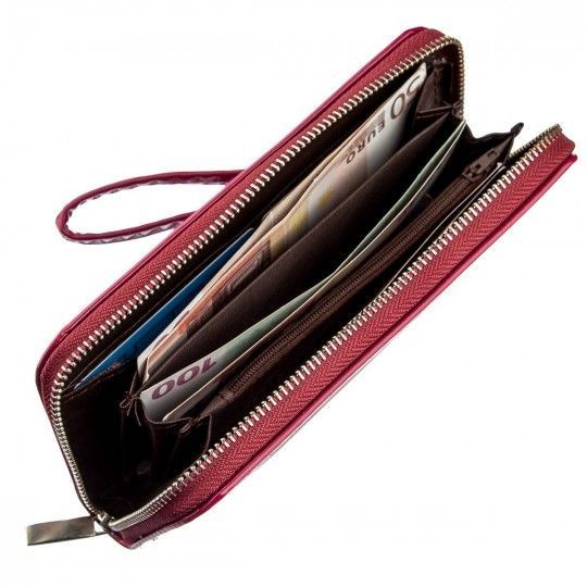 Витончений жіночий гаманець із екошкіри малинового кольору. Аксесуар має весь найнеобхідніший функціонал: просторі відділення для купюр, осередки для карток підібрані під розмір, відділення на блискавці та відкриті кишені. Модель доповнена блискавкою сріблястого кольору та металевим логотипом бренду на лицьовій стороні. Усередині виріб виготовлений з екошкіри у поєднанні з міцним текстилем. У нашому інтернет-магазині ви можете знайти потрібну модель за доступною вартістю.