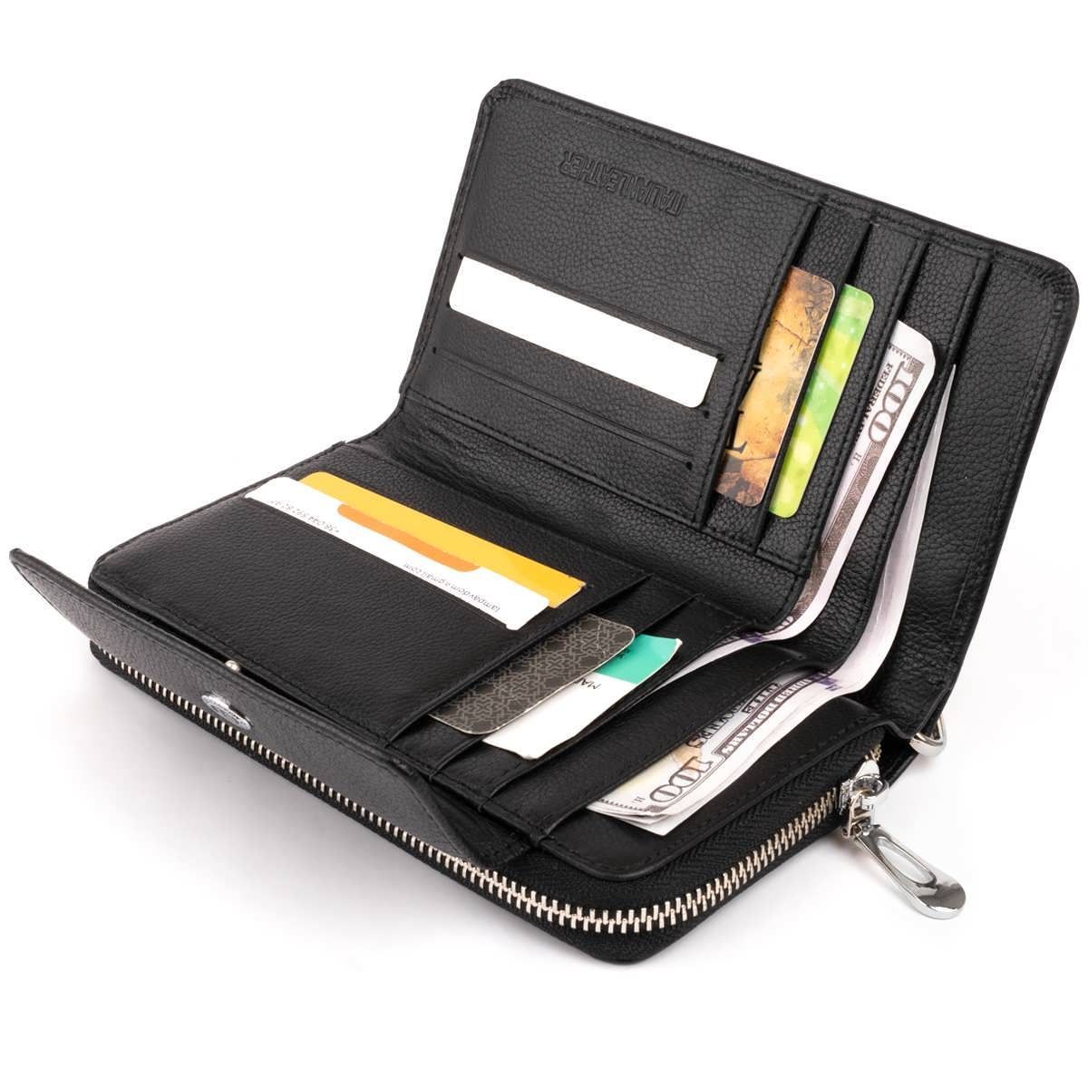 Презентабельный женский кошелек из натуральной кожи, черного универсального цвета. У него много разных отделений и карманов, поэтому можете не переживать, ведь в него поместятся все необходимые вещи. Функциональности этой модели можно позавидовать. Его можно носить в сумке, портфеле, а также как самостоятельный аксессуар. Внутри кошелька достаточно места для удобного расположения купюр, кредиток и других личных вещей. Торопитесь купить клатч для себя или на подарок близкому человеку. При покупке кошелек он будет упакован в фирменную картонную коробку белого цвета.