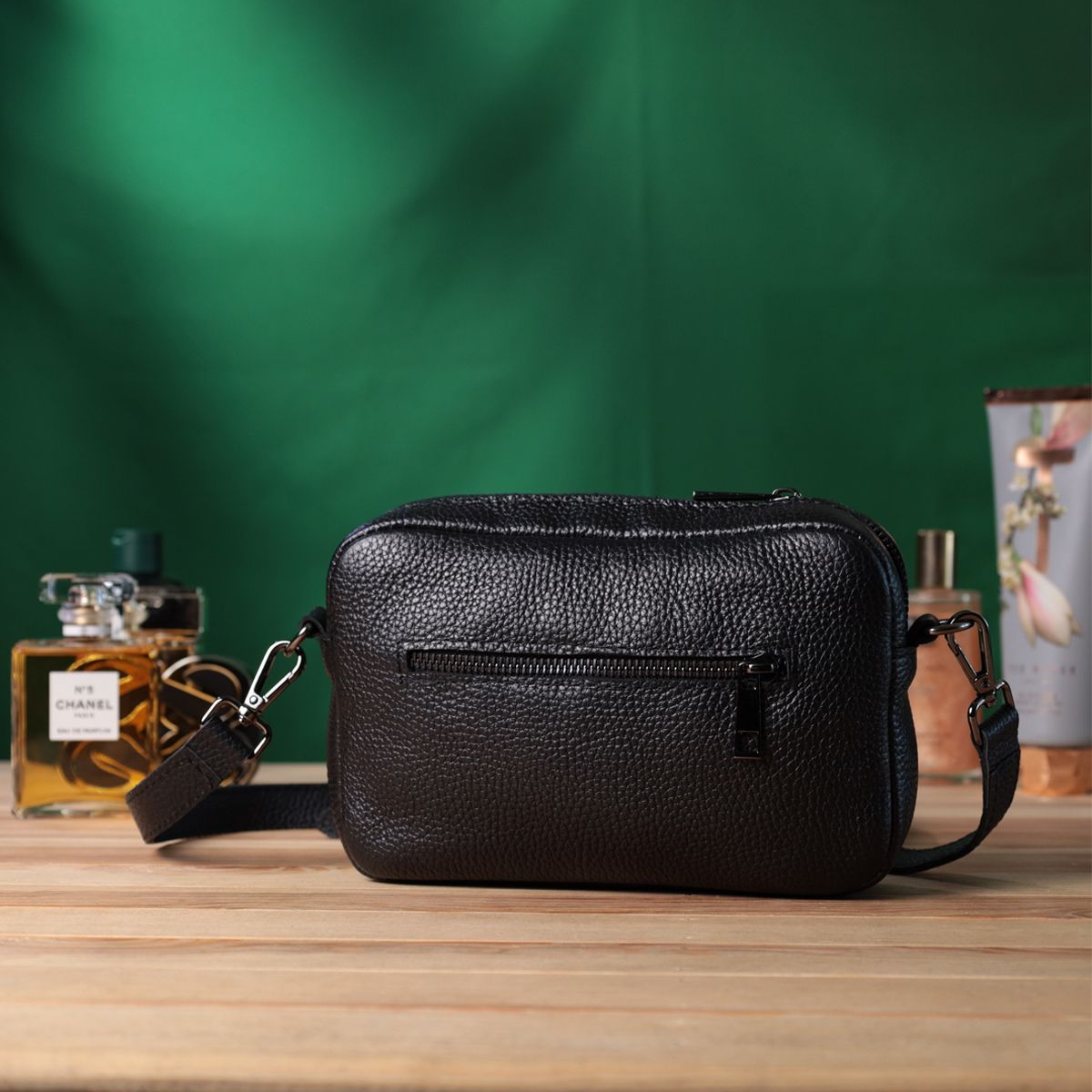 Цікава жіноча сумка, яку можна носити через плече як крос-боді, на плечі і як клатч в руках, для цього ремінець легко відстібається. Виріб виконаний у класичному чорному кольорі із зернистої шкіри, яка м'яка, приємна на дотик та з високими показниками зносостійкості. Відмінний варіант як кожного дня, так і на вечір. Сумка добре тримає форму, має міцну підкладку, фурнітура срібного кольору – стійка не змінює свій колір у процесі носіння. Аксесуар чудово поєднується з усіма стилями в одязі та може стати чудовим подарунком на будь-яке свято.
