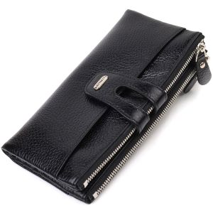 Классический черный женский кошелек из натуральной зернистой кожи. Аксессуар имеет два широких основных отделения, в которые помещаются купюры всех номиналов, две монетницы, двадцать четыре кармана для карточек, два открытых кармана снаружи и одно прозрачное окошко для документов. Закрывается аксессуар хлястиком на кнопку. Если Вы хотите обрадовать себя и удивить близких, то обязательно покупайте кожаные аксессуары в нашем магазине, качество и цена Вас однозначно порадует.