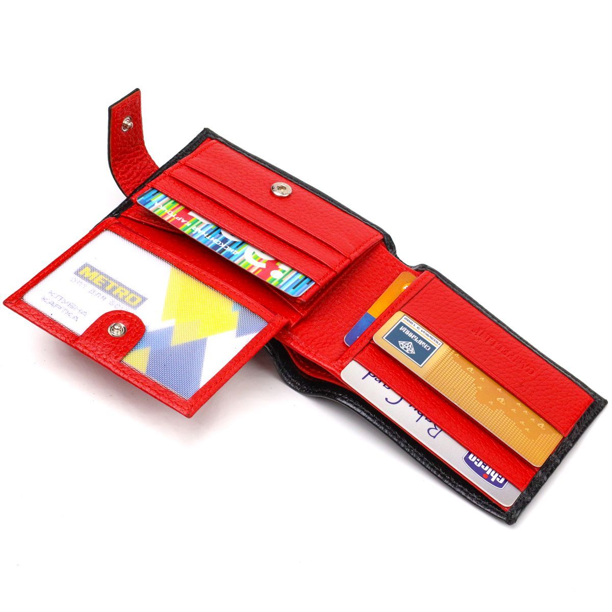 Интересный мужской кошелек, из натуральной кожи, в комбинации двух цветов черного снаружи, красный внутри. Аксессуар имеет одно основное отделение с перегородкой, в которое помещаются купюры всех номиналов, девять карманов для карточек, два из которых под сеточкой, монетница и два близлежащих кармана. Закрывается аксессуар хлястиком на кнопку. Цвет фурнитуры – серебро. Вы легко сможете поместить его в карман брюк или маленькую сумку. Упакованный бумажник картонную коробку. Кожаный кошелек является отличным подарком для родных и близких людей.