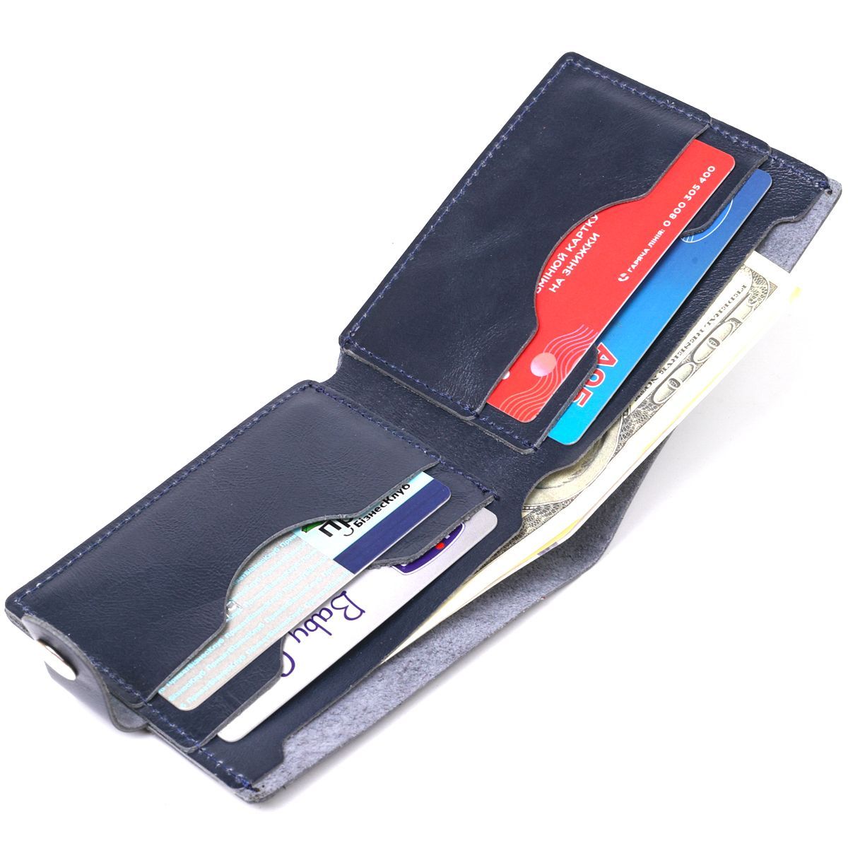 Добротное мужское портмоне в два сборки с идеальным соотношением цены и качества. Выполнено из натуральной кожи высокой прочности и стойкости к износу. Внутреннее наполнение представлено в виде просторного отделения для купюр и нескольких слотов для банковских карт. Цвет изделия – темно-синий с легким отливом, фактура – гладкая.