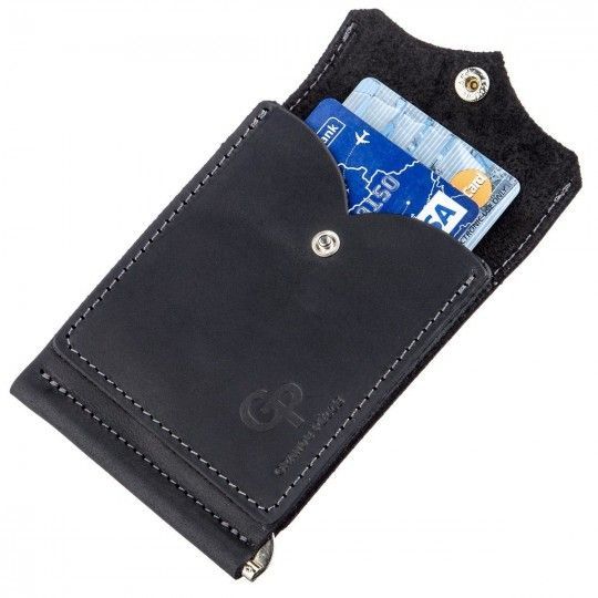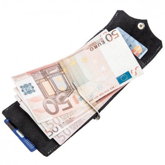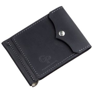 Чорний компактний затиск із італійської натуральної шкіри найвищої якості. На лицьовій стороні аксесуара тиснений логотип бренда-виробника. Затискач стане вам ідеальним рішенням, якщо ви не є шанувальником портмоне або клатчею. Мінімальний розмір легко поміститься у кишеню чи маленьку сумку. Закривається виріб на шкіряний хлястик із кнопкою. Сама конструкція затиску виконана із надійного металу сріблястого кольору. Такий аксесуар стане чудовим подарунком на будь-яке свято.
