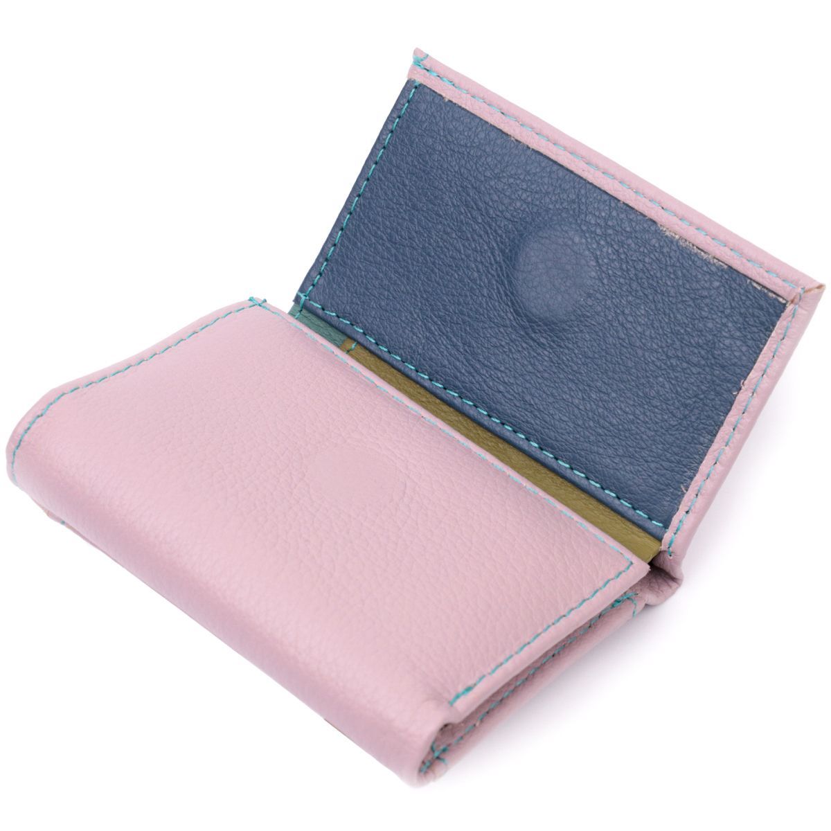 Ніжне жіноче портмоне в три складення з натуральної шкіри найвищої якості. Акцентом цього гаманця є колір, точніше кілька кольорів – він бежево-рожевого кольору зовні та багатобарвний усередині. Аксесуар складається з двох містких відділень для купюр, двох осередків для карток та кишені для монет. Зовні виріб прошитий рівним рядком бірюзового кольору по краю і прикрашений металевим логотипом компанії виробника. Портмоне доповнено надійною фурнітурою та міцною підкладкою. Укомплектований гаманець у фірмову картонну коробку білого кольору.