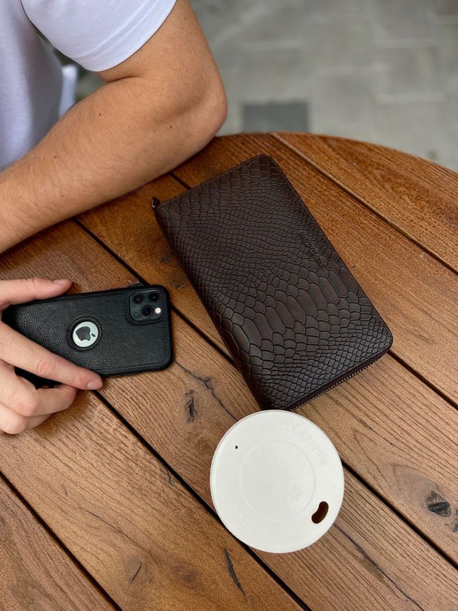 Чоловічий гаманець по типу клатча не тільки стильний але і практичний. У ньому є все необхідне: відділення для купюр, кишеня-перегородка на блискавці для монет та блок під картки. 2 прилеглі до стінки кишені підходять для банкнот або паперів. Відкритий доступ до 24 карток. До того ж у ньому є петля для носіння ручки. На особливу увагу заслуговує стиль шкіряного чоловічого гаманця: тиснення під шкіру змії вдало поєднується з металевою блискавкою. Аксесуар можна носити як клатч: для цього передбачено 2 ремені: на зап'ястя та долоню.