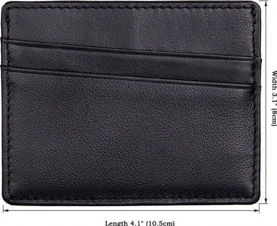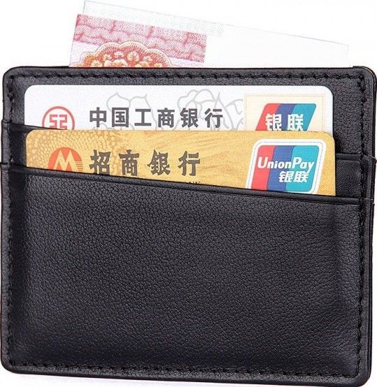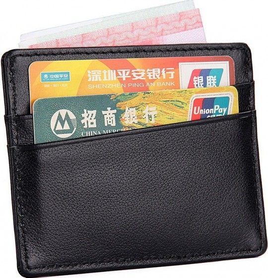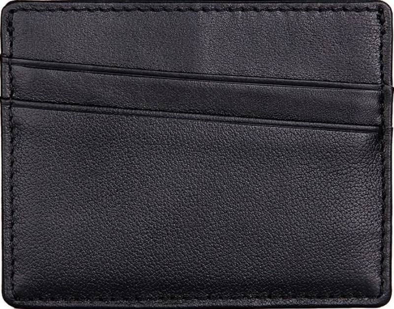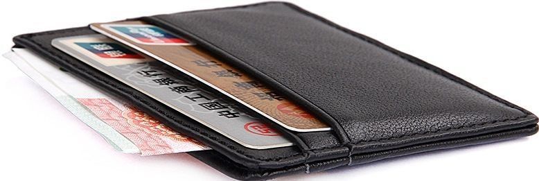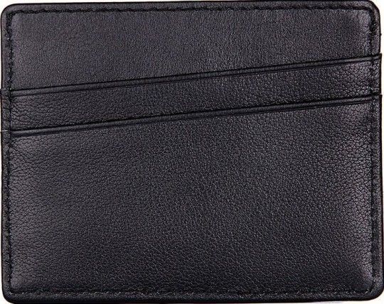 Компактная кожаная кредитница из натуральной кожи черного цвета без застежки. Такой аксессуар выглядит очень элегантно и может использоваться для хранения купюр. Кредитница упакована в текстильный чехол.