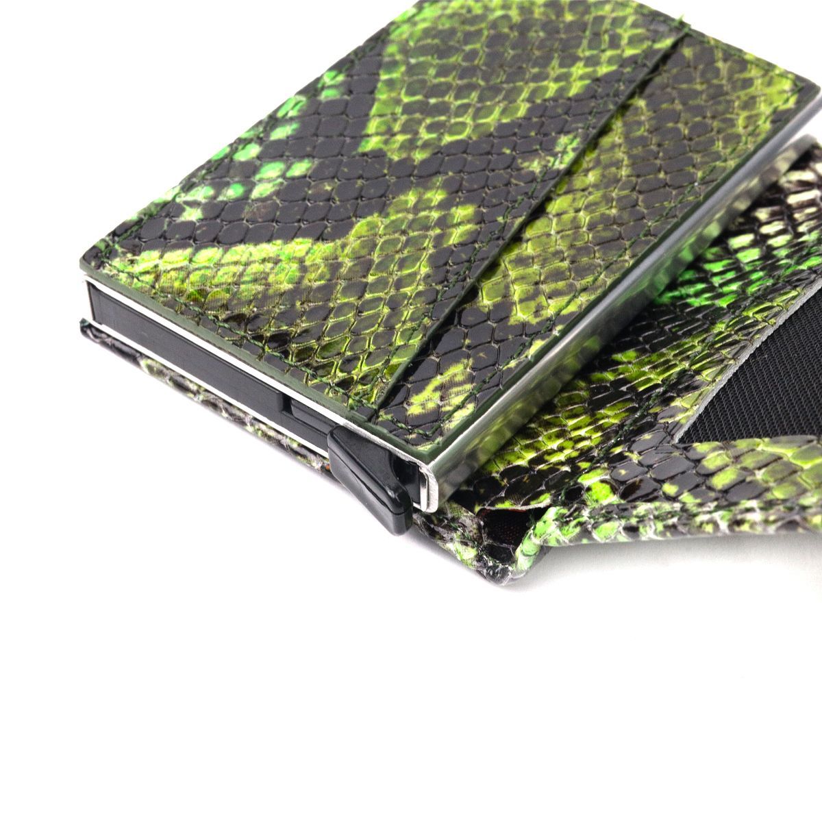 Функциональный картхолдер из лакированной фактурной кожи, с тиснением под змею, предназначен для хранения банковских и дисконтных карт и небольшого количества наличных денег. Имеет лаконичный дизайн, отлично ложится в руку, помещается в карман, а также в любую сумку. Кожа мягкая, приятная на ощупь. Механизм работает надежно и удобен в использовании; карточки хорошо закреплены в аксессуаре. Отличная идея для подарка близкому человеку.
