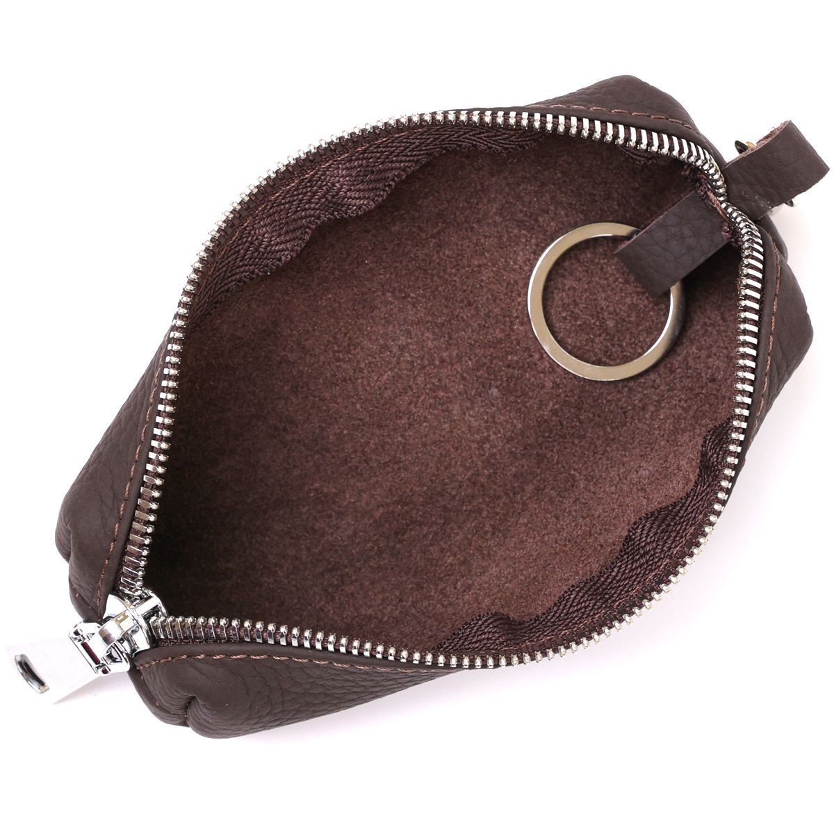Очень красивая и стильная ключница в коричневом матовом цвете, что выглядит очень необычно и современно. Материал изготовления – натуральная кожа высокого качества, которая на ощупь очень мягкая и приятная. Фактура изделия – зернистая, фурнитура сделана в цвете под серебро, закрывается аксессуар на удобную молнию.