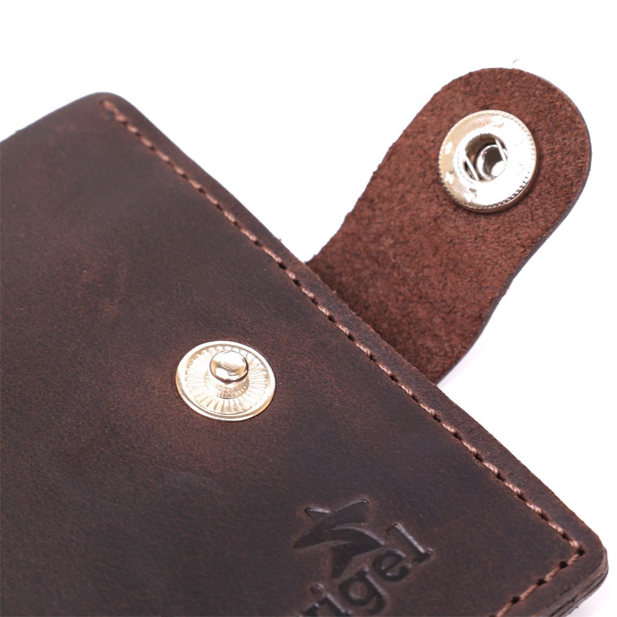 Добротное портмоне в две сборки для стильных и современных мужчин. Выполнено изделие из натуральной высококачественной кожи высокого класса, которая устойчива к износу. Цвет аксессуара – матовый темно-коричневый, выглядящий много и красиво. Фактура – гладкая и приятная на ощупь. Закрывается портмоне на хлястике с кнопкой.