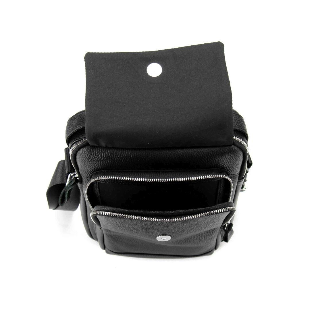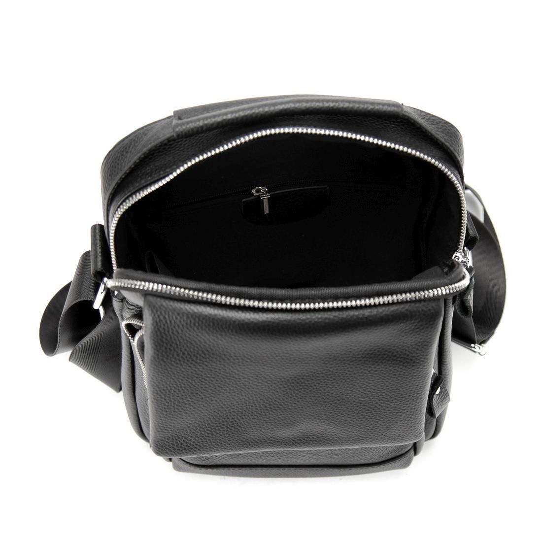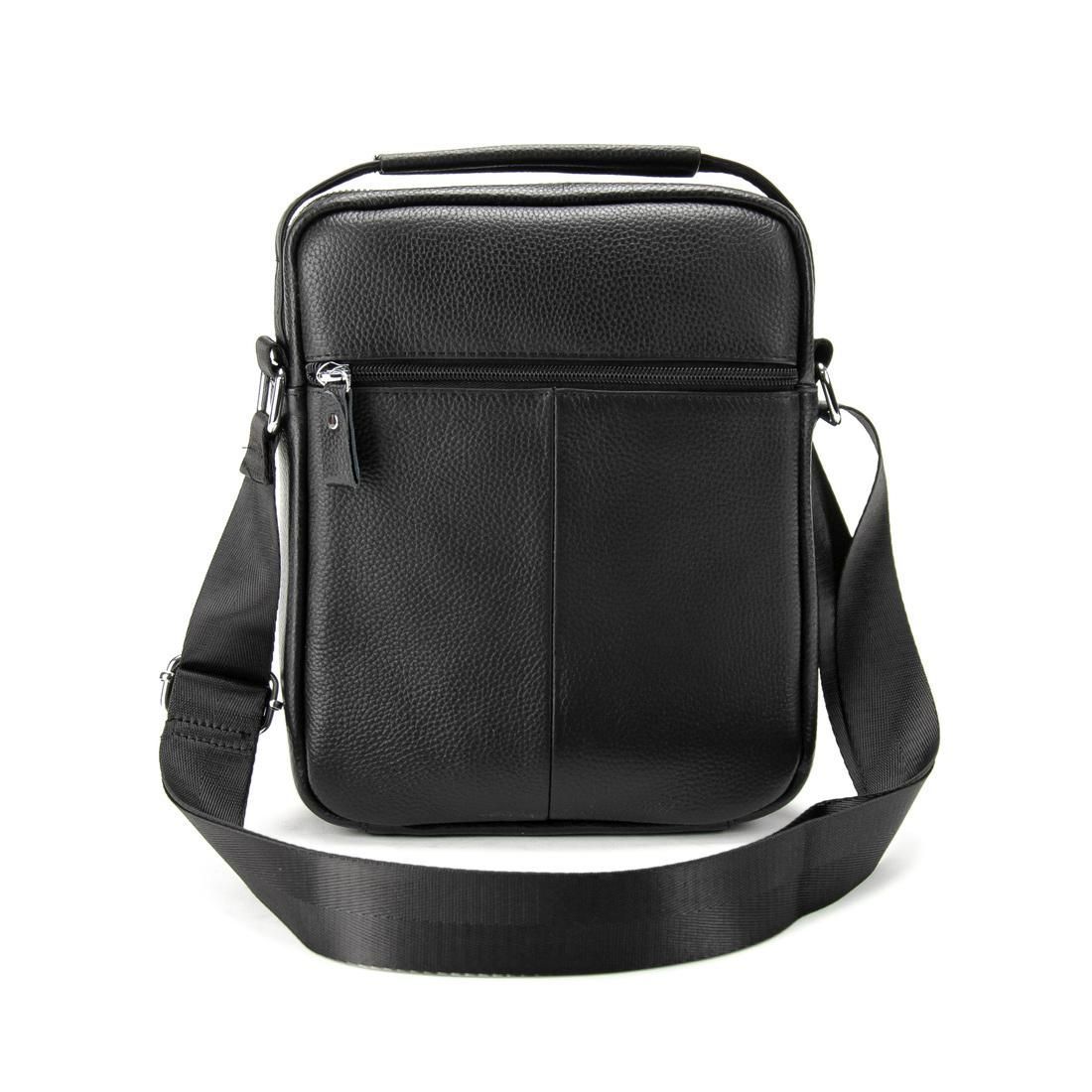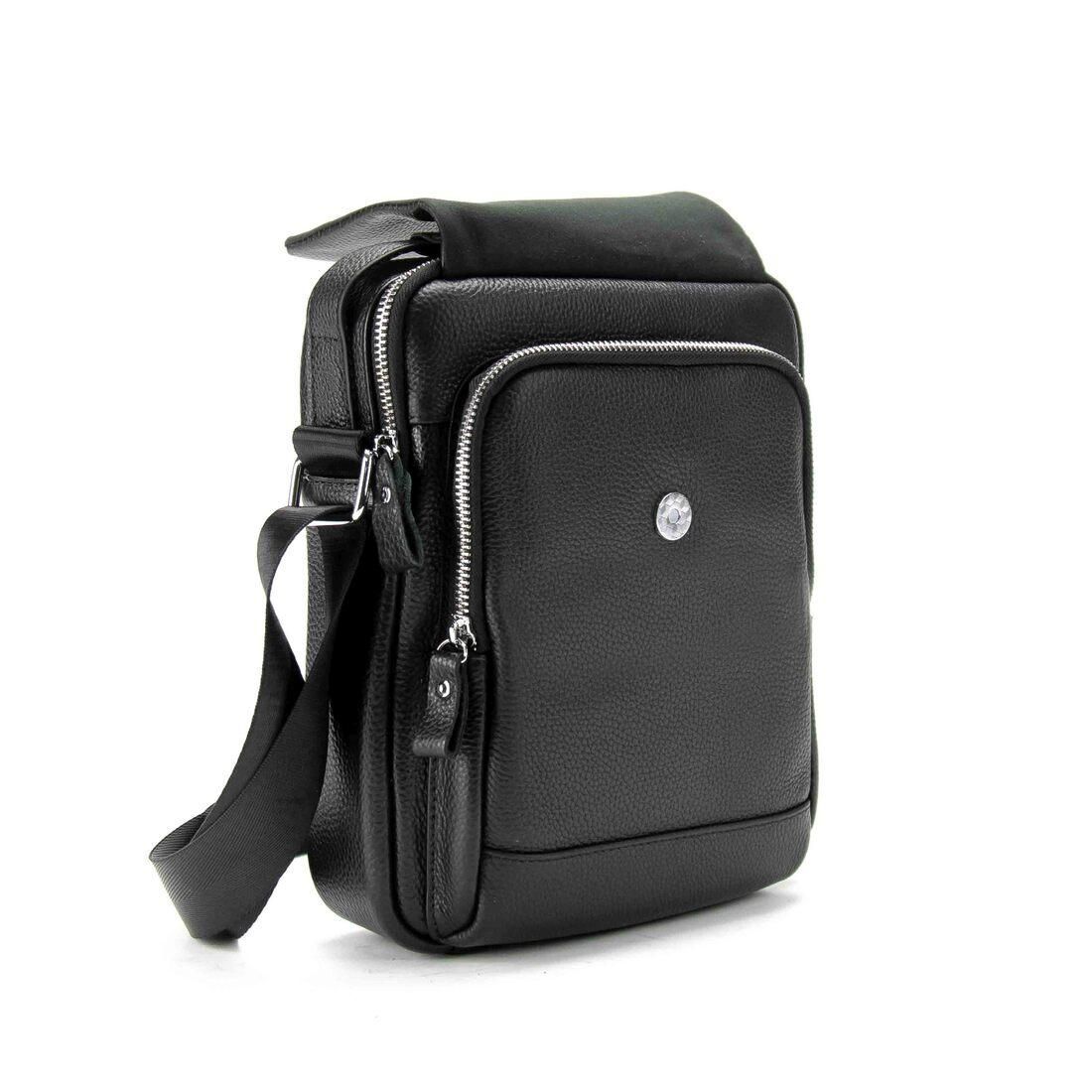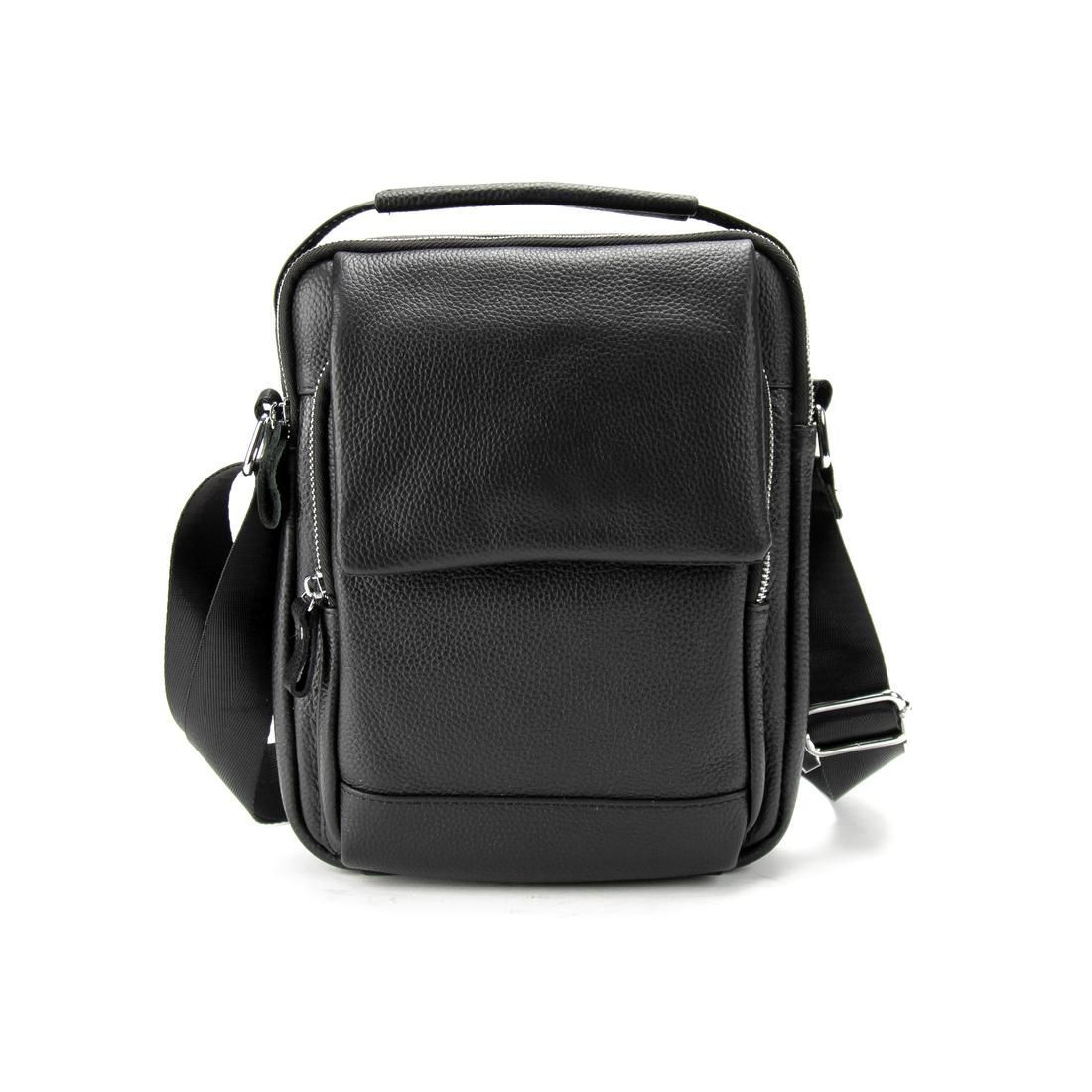 Сумка через плече Tiding Bag A25F-FL-9747A з натуральної шкіри чорного кольору, зернистої фактури. Розмір: 21 x 5 x 26 см. Чоловічі шкіряні сумки чорного кольору. Плечовий ремінь регулюється по довжині. У сумці три відділення. Із заднього боку є кишеня на блискавці. Аксесуар оснащений шкіряною ручкою для перенесення. Підкладка: Текстиль. Колір чорний. Колір фурнітури: срібло.