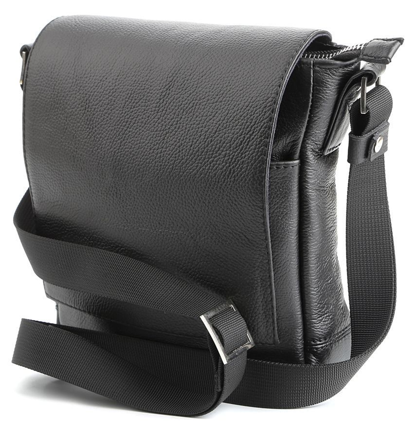 Компактная мужская кожаная сумка из-за плеча украинского производства. Кожа, из которой выполнен этот аксессуар, приятна на ощупь и имеет зернистую фактуру. Цвет фурнитуры: серебро. Сумка закрывается с помощью клапана на двух скрытых магнитах и металлической молнией. Под клапаном расположен накладной карман. На задней наружной стороне этого аксессуара находится отделение на молнии. Сумка носится через плечо с помощью регулируемого текстильного плечевого ремня.