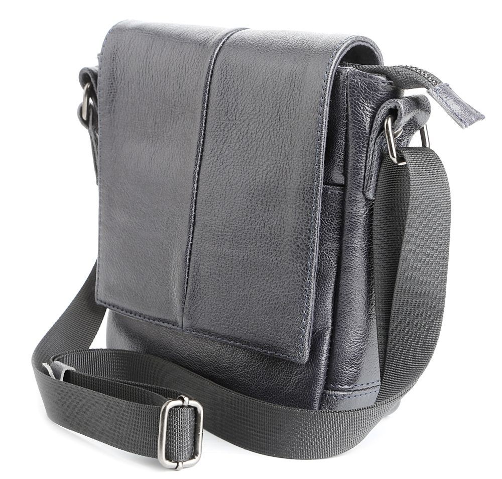 Высококачественная мужская кожаная сумка. Аксессуар можно носить через плечо с помощью регулируемого текстильного ремня черного цвета. Изделие закрывается кожаным клапаном на двух скрытых магнитах и молнией. Под клапаном расположен накладной карман. На задней наружной стороне находится отделение на молнии. Цвет фурнитуры: серебро. Кожаная сумка станет отличным подарком мужчине к любому празднику. Внутри: