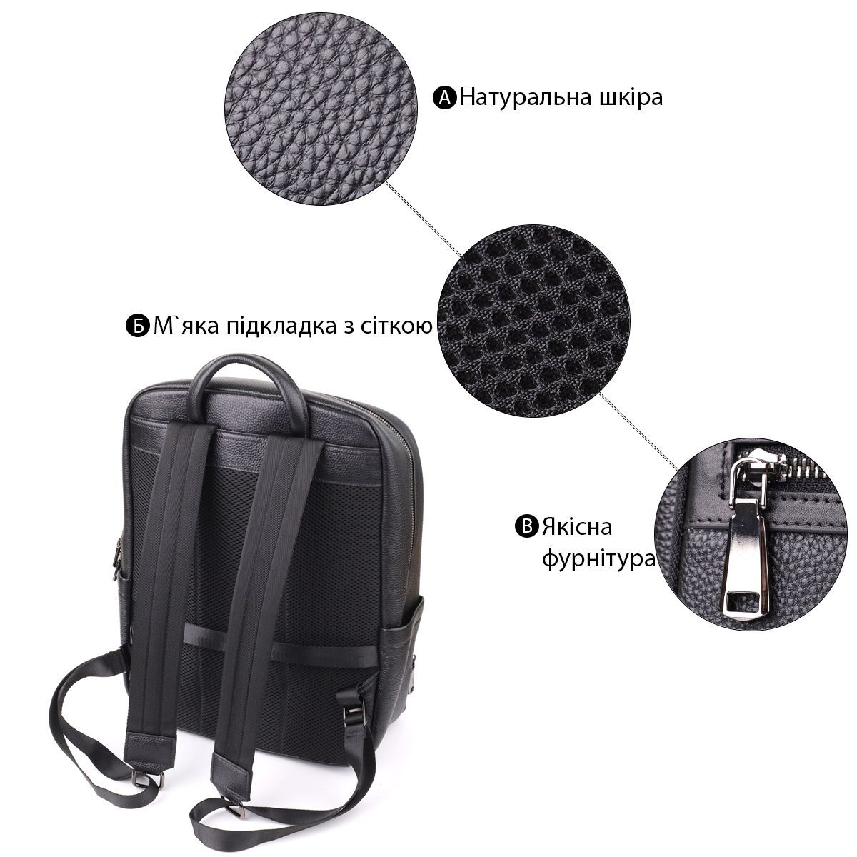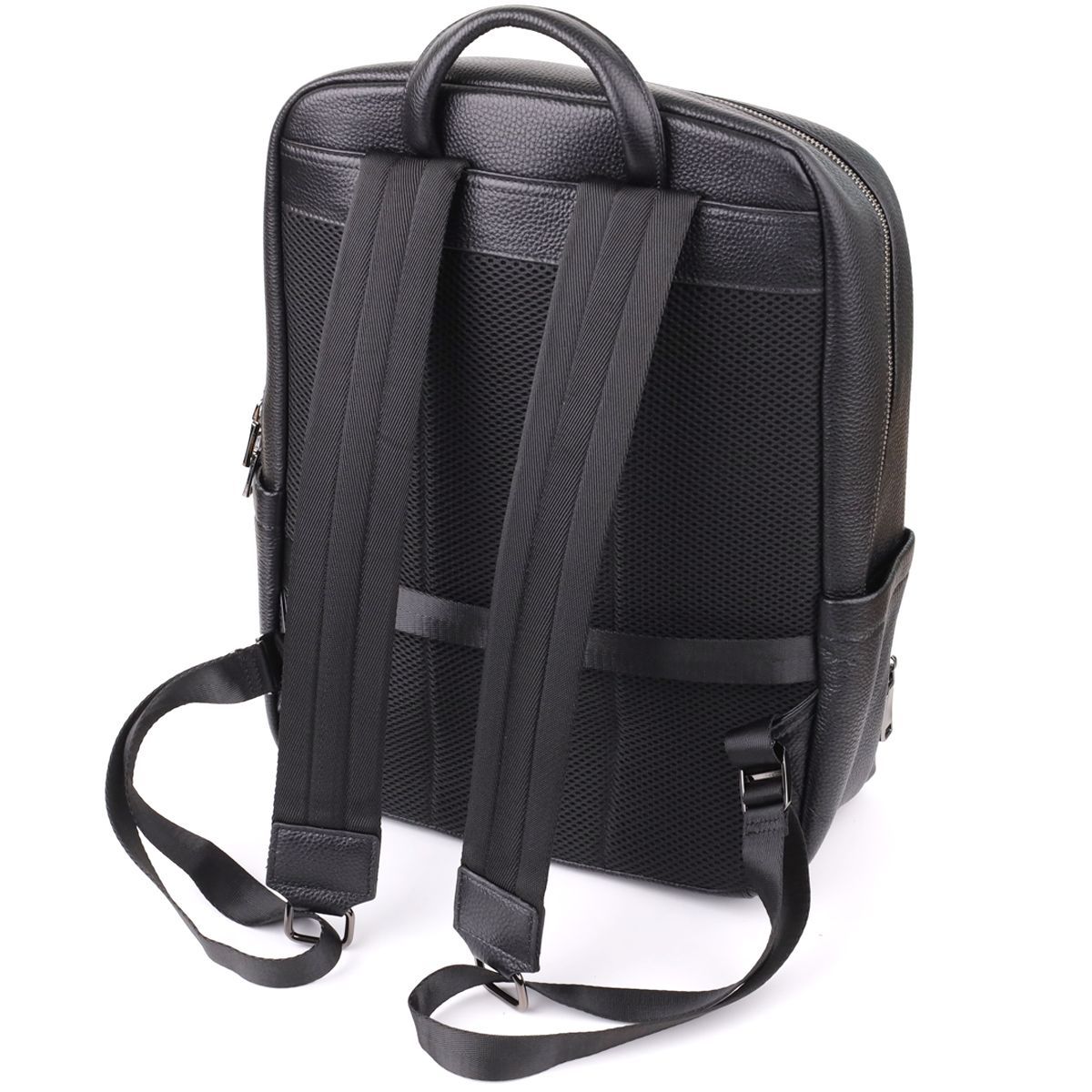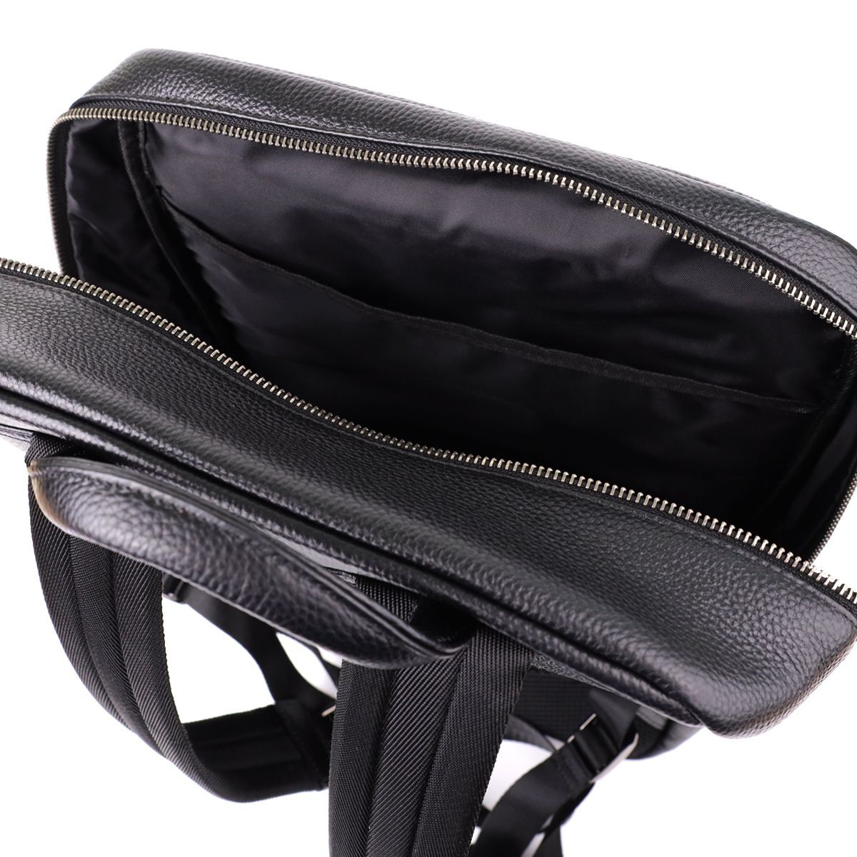 Стильний шкіряний рюкзак виконаний з натуральної шкіри з виразною текстурою та оснащений одним основним відділенням на блискавці з двома бігунками, що забезпечує зручний доступ та місткість. Усередині знаходяться дві відкриті кишені для зручної організації дрібних речей. На лицьовій стороні розташовані накладна та вбудована кишені, що закриваються на блискавці. Для комфортного перенесення передбачена шкіряна ручка, м'які лямки, що регулюються, і ортопедична спинка, яка знижує навантаження на хребет при тривалому носінні. Фурнітура виконана в кольорі темного срібла, підкреслюючи стиль та елегантність моделі. Цей рюкзак стане надійним та зручним супутником у повсякденному житті.