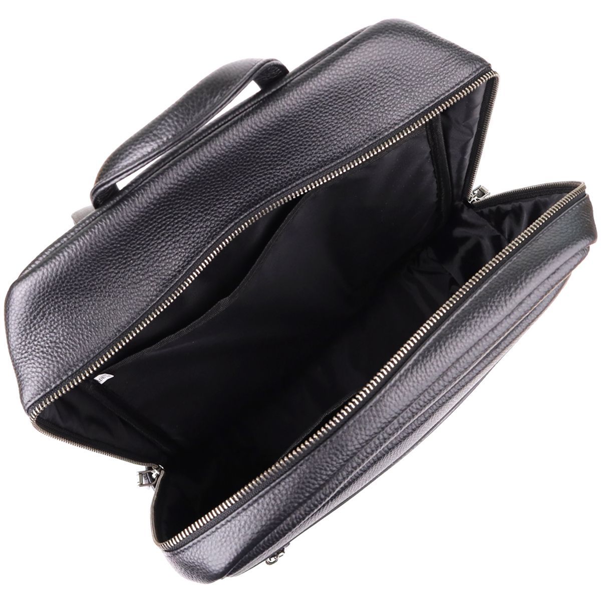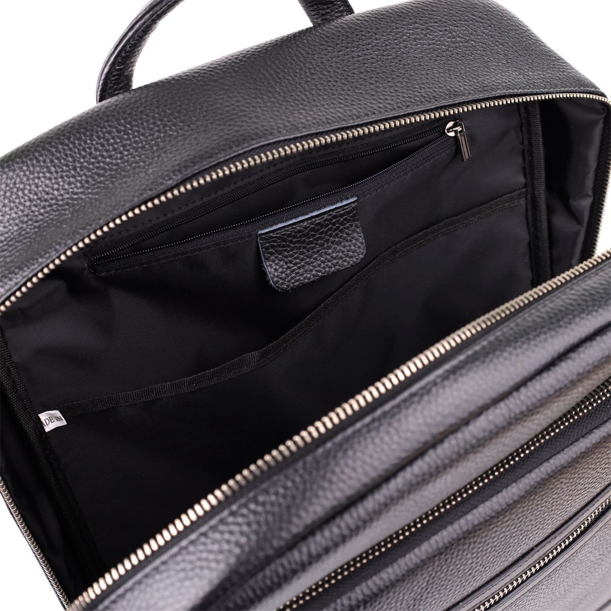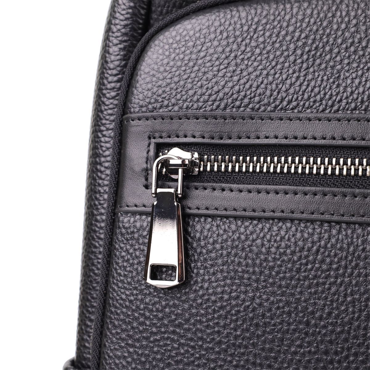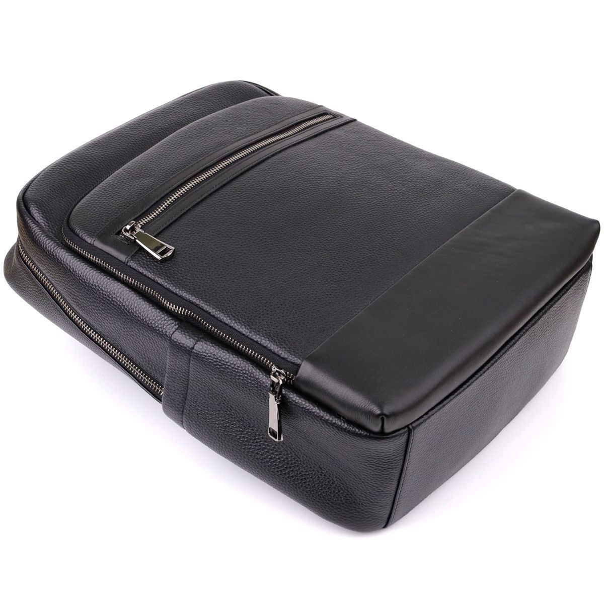 Стильний шкіряний рюкзак виконаний з натуральної шкіри з виразною текстурою та оснащений одним основним відділенням на блискавці з двома бігунками, що забезпечує зручний доступ та місткість. Усередині знаходяться дві відкриті кишені для зручної організації дрібних речей. На лицьовій стороні розташовані накладна та вбудована кишені, що закриваються на блискавці. Для комфортного перенесення передбачена шкіряна ручка, м'які лямки, що регулюються, і ортопедична спинка, яка знижує навантаження на хребет при тривалому носінні. Фурнітура виконана в кольорі темного срібла, підкреслюючи стиль та елегантність моделі. Цей рюкзак стане надійним та зручним супутником у повсякденному житті.
