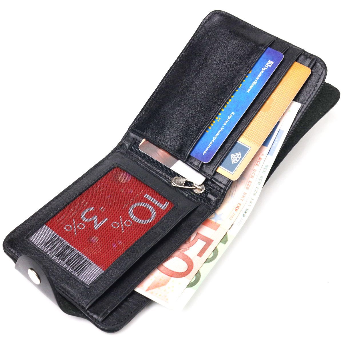 Современный мужской кошелек из натуральной гладкой кожи. Аксессуар имеет одно отделение для купюр, в которое размещаются купюры всех номиналов, четыре прилегающих кармана, карман на молнии, на всю длину кошелька, а также восемь отсеков для карточек, один из них под сеточкой. Модель закрывается хлястиком на кнопку. В современном мире кожаный портмоне является просто необходимой вещью, а качественный кожаный портмоне является еще и неплохим вложением денег, поскольку прослужит не один год.