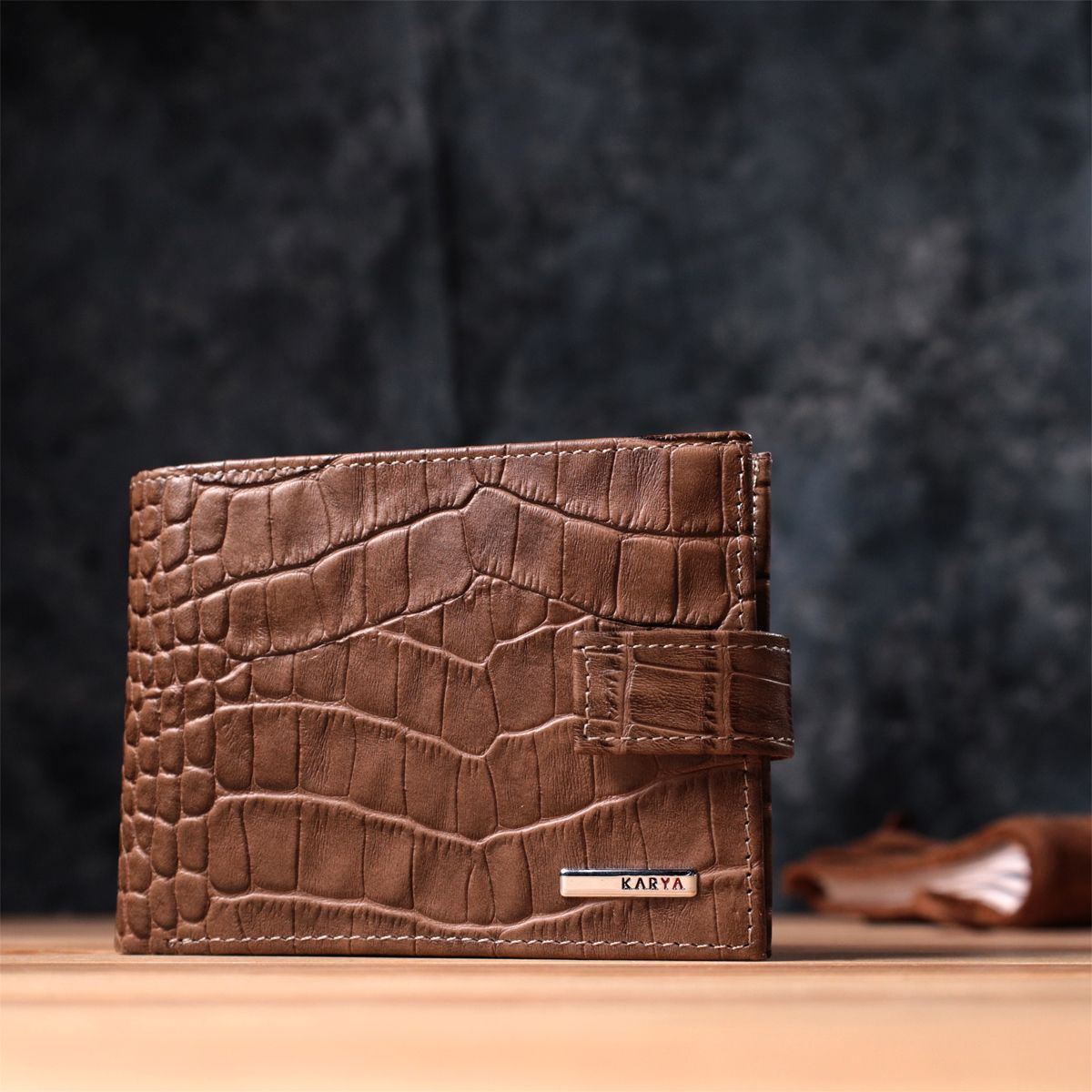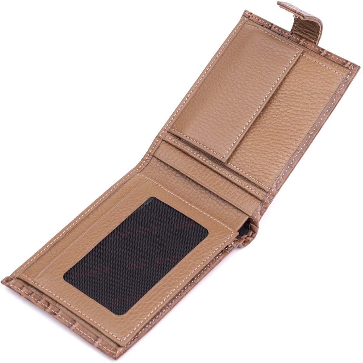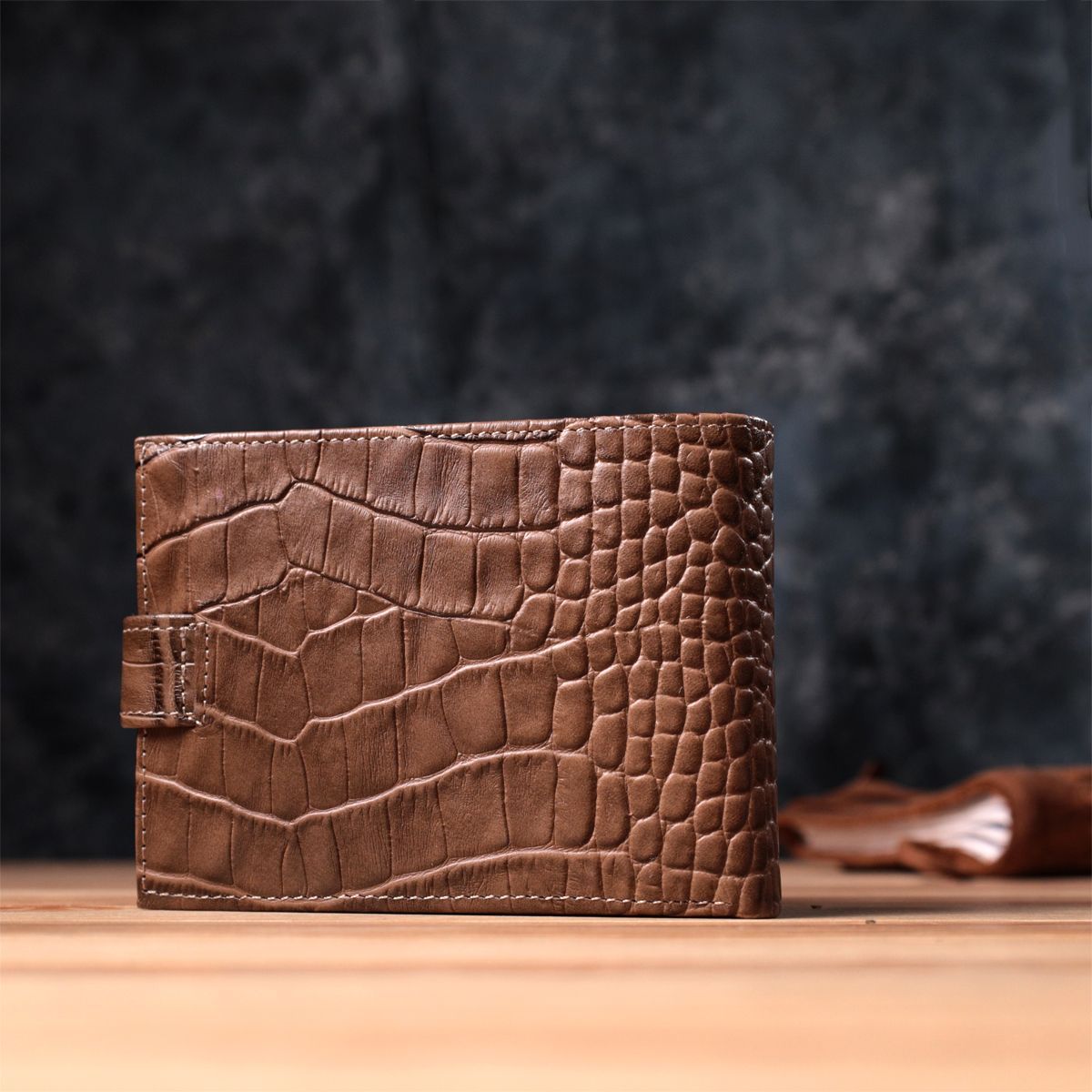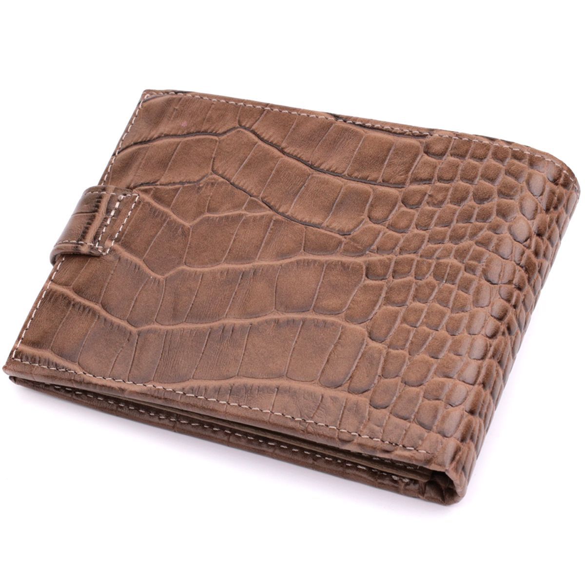 Зручний чоловічий гаманець із натуральної шкіри із тисненням під крокодила, у красивому коричневому кольорі. Виріб закривається на хлястик із кнопкою. На лицьовій стороні у вигляді декору розташований логотип виробника. Аксесуар упакований у фірмову коробочку. Вироби з натуральної шкіри завжди будуть чудовим подарунком для близької людини.