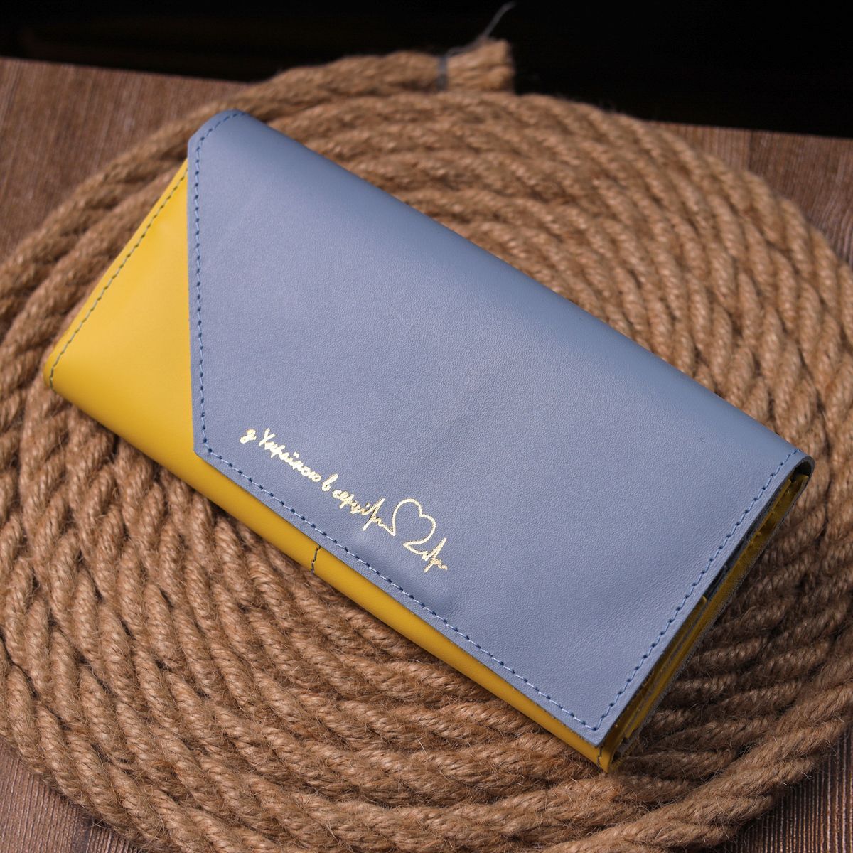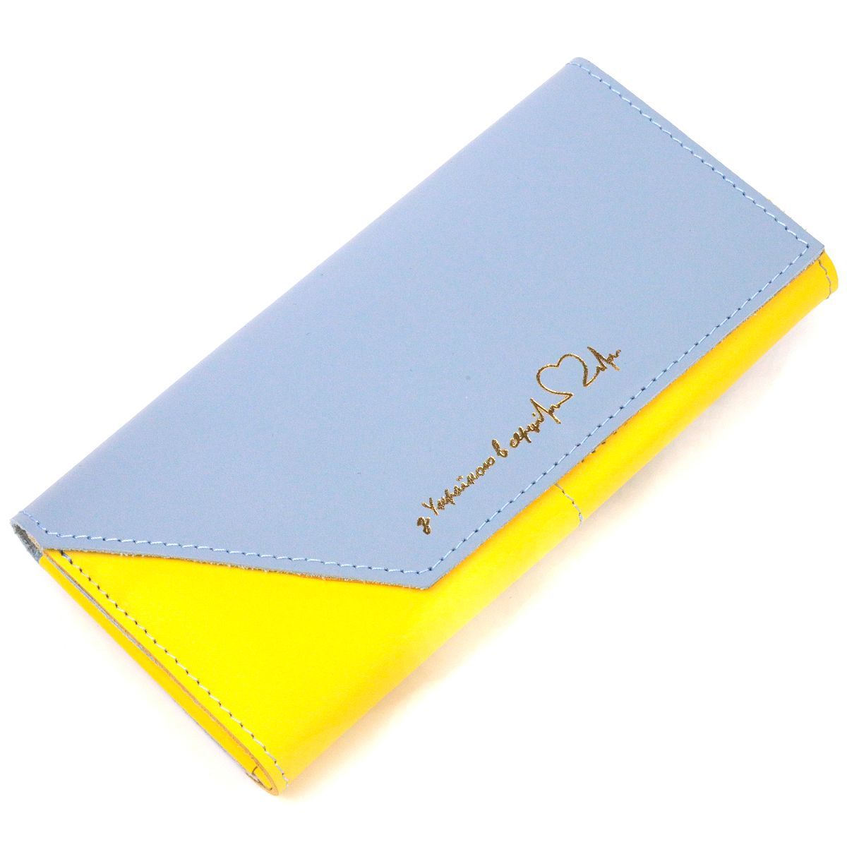 Вместительный кожаный кошелек, в сочетании двух цветов желтого и голубого с патриотической надписью "С Украиной в сердце". Изделие сшито из качественной кожи, с высокими показателями износостойкости. Портмоне имеет три больших отделения для купюр всех номиналов, а также восемь отделений для карт, монетницу на молнии и закрывается клапаном на магниты. Кожаный кошелек станет отличным подарком на все праздники.