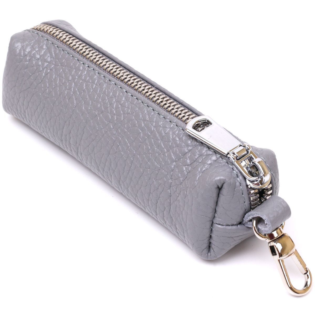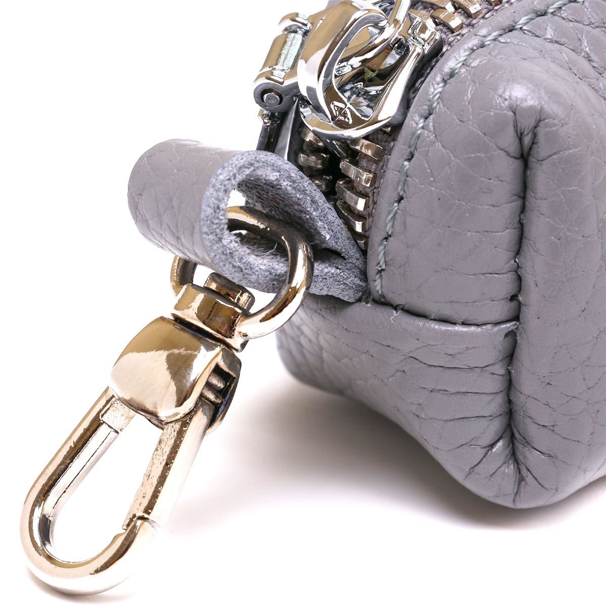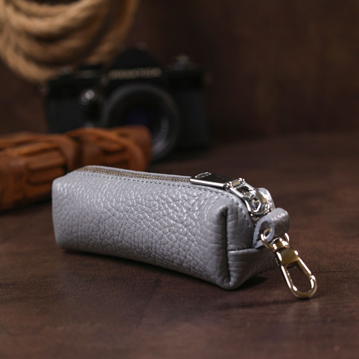 Великолепная ключница в красивом трендовом сером цвете. Материал изготовления – натуральная кожа высокого качества с отличными характеристиками. Закрывается аксессуар на молнию, внутри есть металлическое кольцо для ключей, снаружи – карабин. Фактура – зернистая и очень приятная на ощупь.