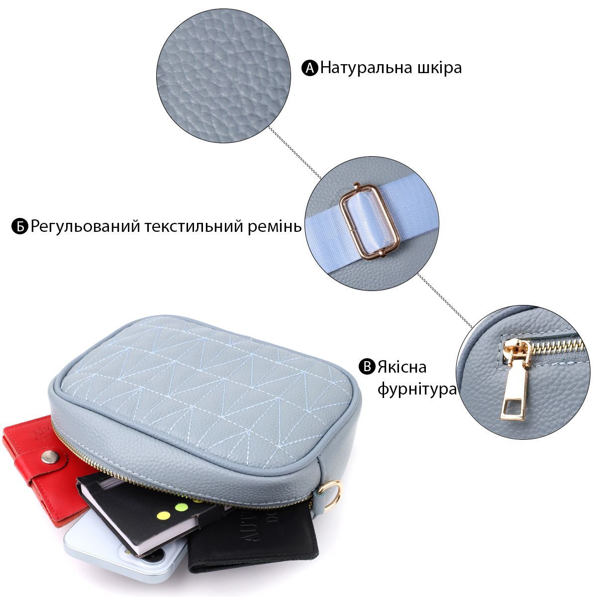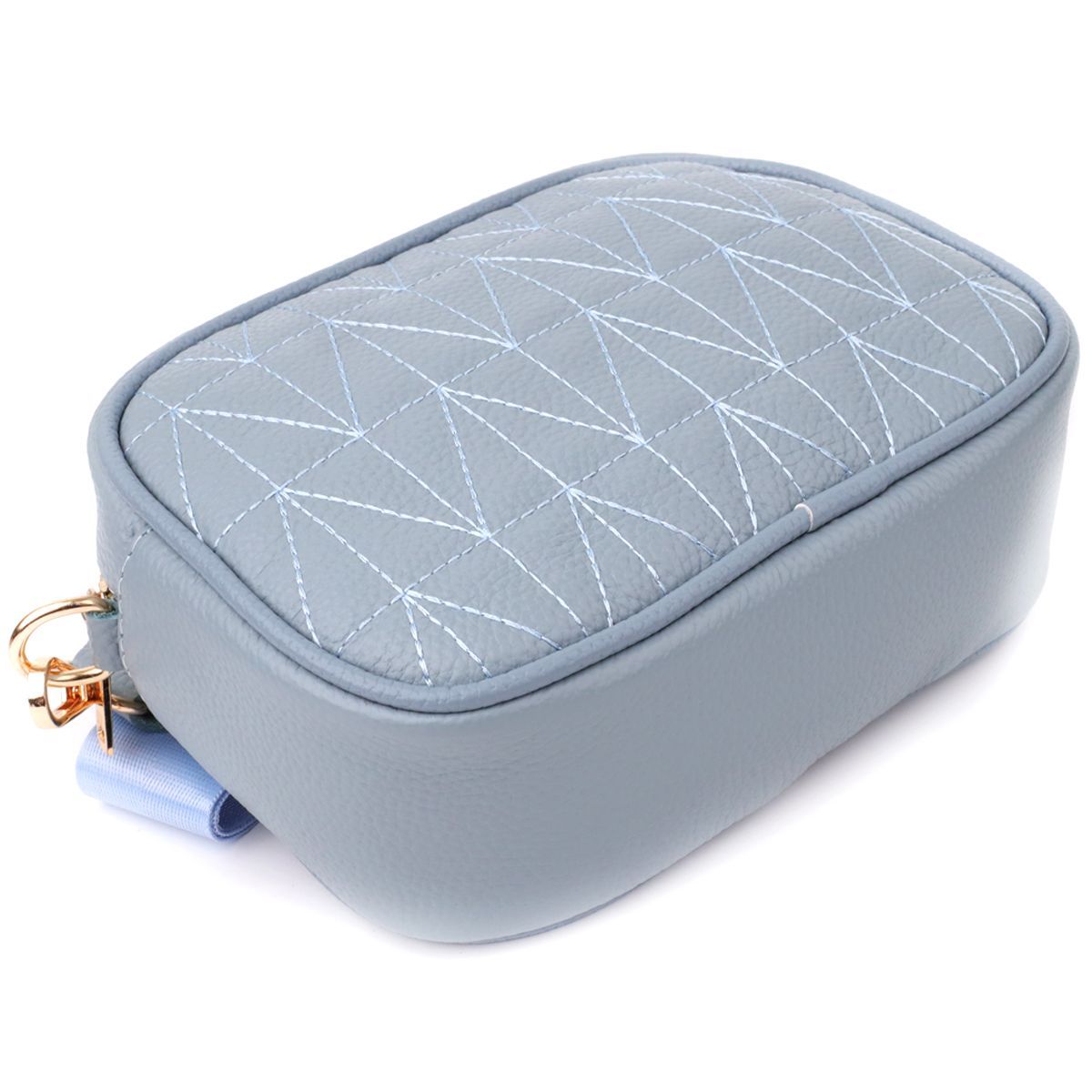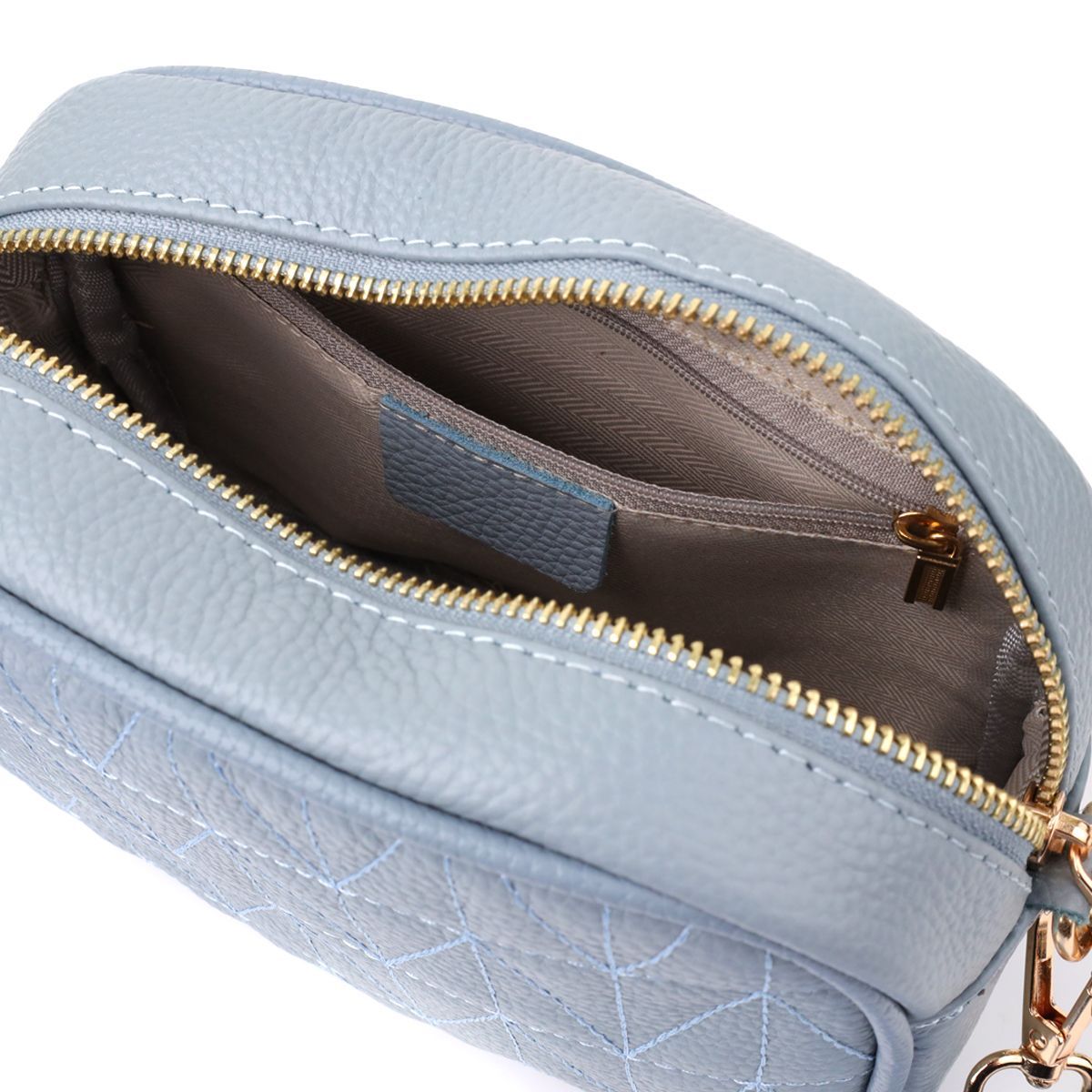 Витончена стьобана сумка Vintage у сіро-блакитному кольорі з натуральної шкіри стане стильним та незвичайним аксесуаром, додаючи свіжості та легкості образу. Щільна та якісна шкіра робить сумку приємною на дотик та підкреслює високий рівень виконання. Компактна форма надає акуратного та сучасного вигляду, а стібка на лицьовій стороні додає дизайнерський шарм. Сумка закривається на блискавку, всередині розташоване основне відділення з кишенею на блискавці та відкритою кишенею для дрібниць, а на тильній стороні знаходиться зовнішня кишеня на блискавці для зручного зберігання найнеобхідніших речей. Знімний текстильний ремінь, що регулюється, забезпечує комфорт при носінні, а фурнітура під жовте золото гармонійно відтіняє холодний сіро-блакитний тон шкіри. Ця сумка стане універсальним аксесуаром для повсякденних образів та особливих випадків, підкреслюючи витончений смак та любов до якісних матеріалів.