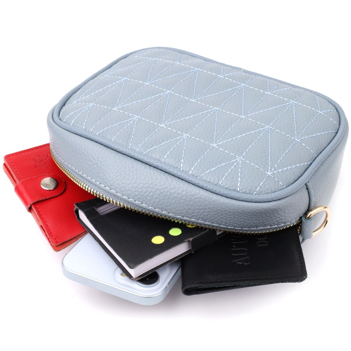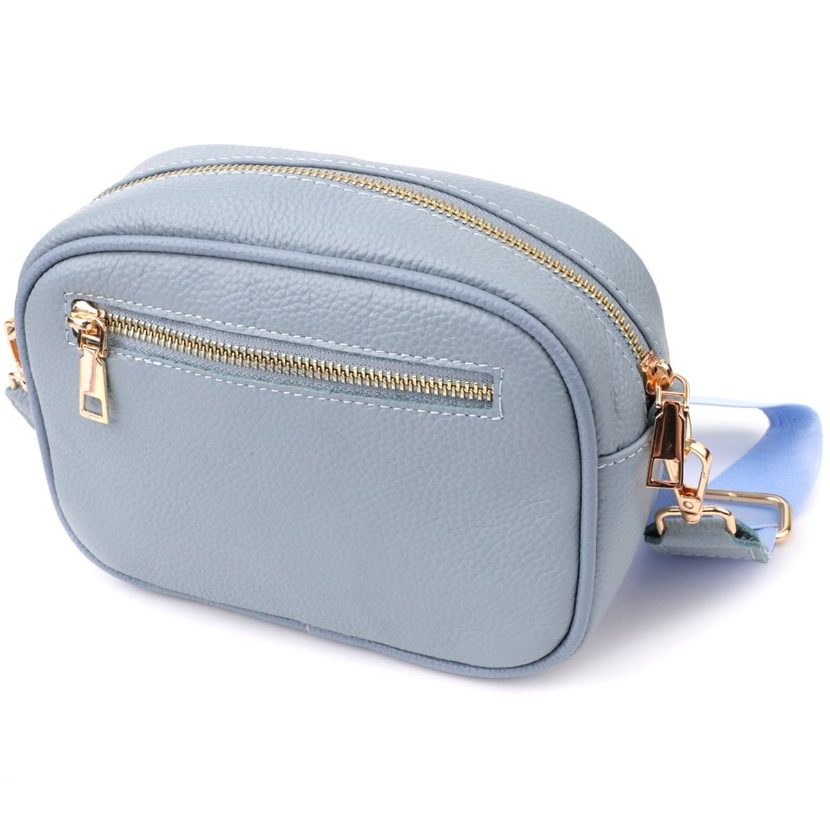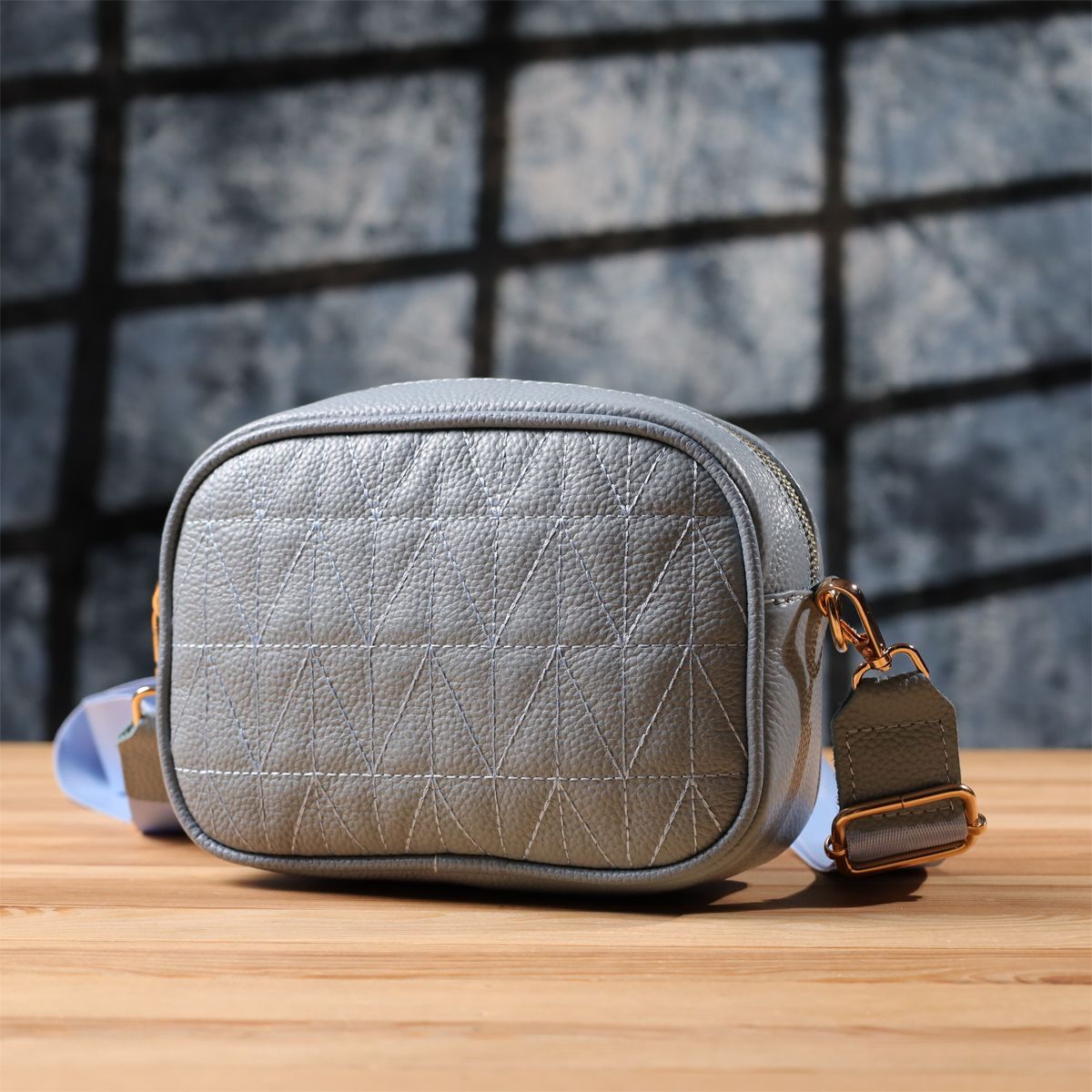 Витончена стьобана сумка Vintage у сіро-блакитному кольорі з натуральної шкіри стане стильним та незвичайним аксесуаром, додаючи свіжості та легкості образу. Щільна та якісна шкіра робить сумку приємною на дотик та підкреслює високий рівень виконання. Компактна форма надає акуратного та сучасного вигляду, а стібка на лицьовій стороні додає дизайнерський шарм. Сумка закривається на блискавку, всередині розташоване основне відділення з кишенею на блискавці та відкритою кишенею для дрібниць, а на тильній стороні знаходиться зовнішня кишеня на блискавці для зручного зберігання найнеобхідніших речей. Знімний текстильний ремінь, що регулюється, забезпечує комфорт при носінні, а фурнітура під жовте золото гармонійно відтіняє холодний сіро-блакитний тон шкіри. Ця сумка стане універсальним аксесуаром для повсякденних образів та особливих випадків, підкреслюючи витончений смак та любов до якісних матеріалів.