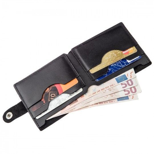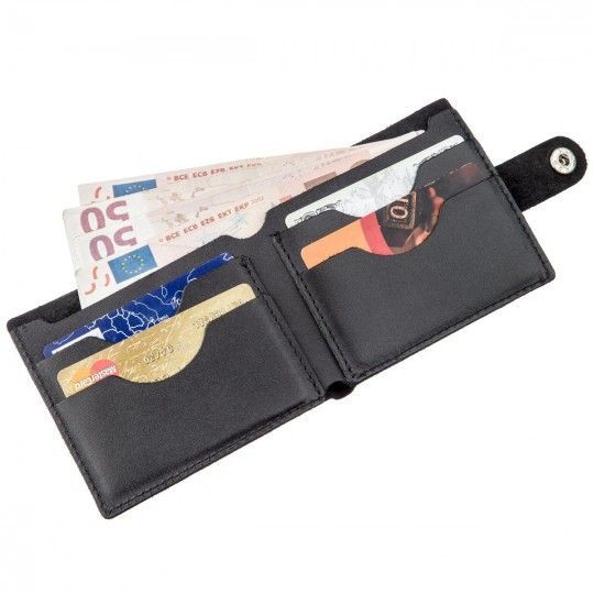 Шикарный мужской кошелек черного цвета. Аксессуар выполнен из толстой, высококачественной кожи. На лицевой стороне изделия расположен тесный логотип компании изготовителя SHVIGEL. Кошелек аккуратно прошит крепкой нитью. Внутри кошелька вместительное открытое отделение для купюр и несколько слотов для карточек. Закрывается на кожаный хлястик с кнопкой. Эта модель доступна в разном цвете. Производство – Украина.