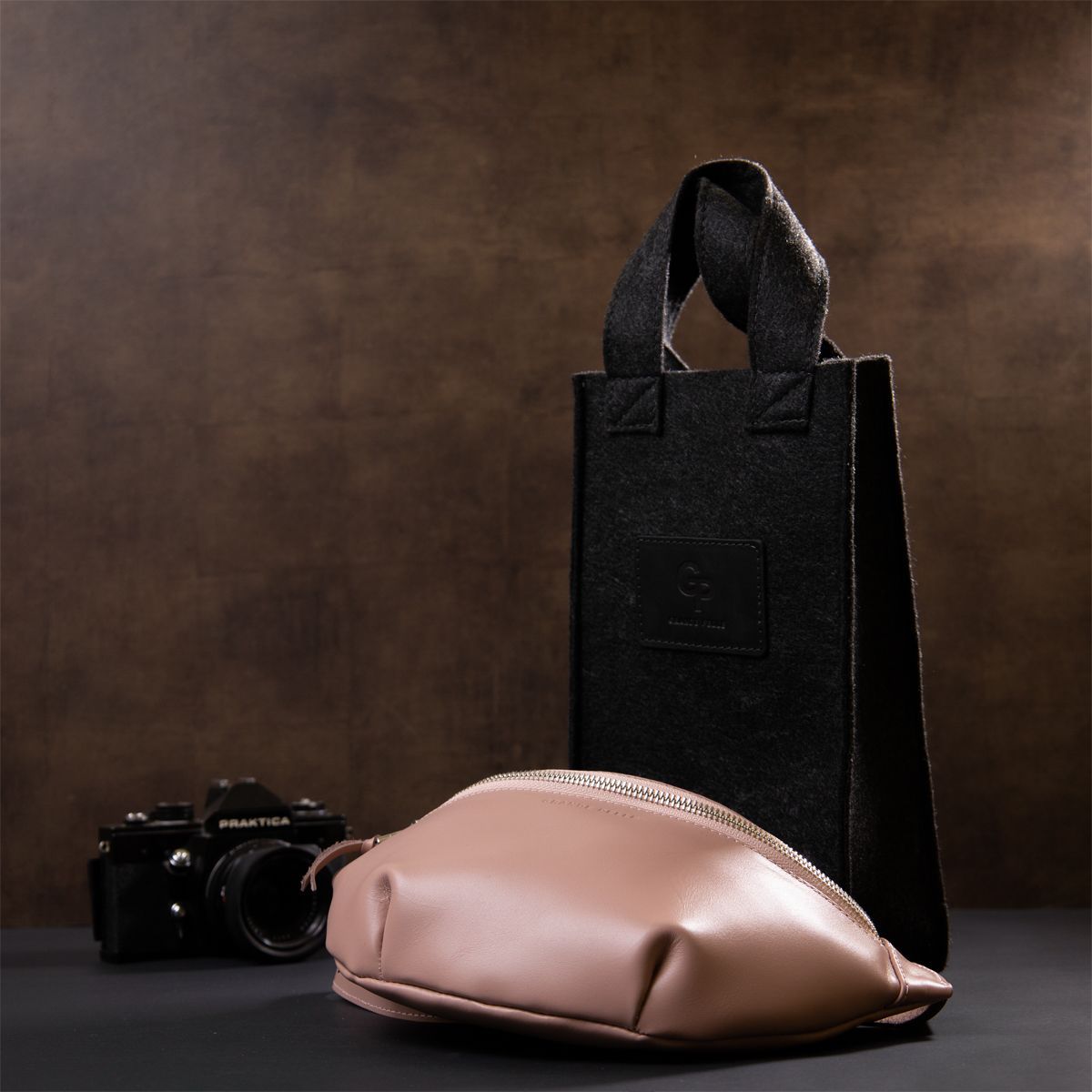 Практичная женская поясная сумка из высококачественной натуральной кожи. Имеет просторное отделение и дополнительный карман на всю длину. На внешней задней стороне есть карман на молнии для быстрого доступа. Цвет изделия – нежно-розовый. Это изделие станет отличным подарком на любой праздник.