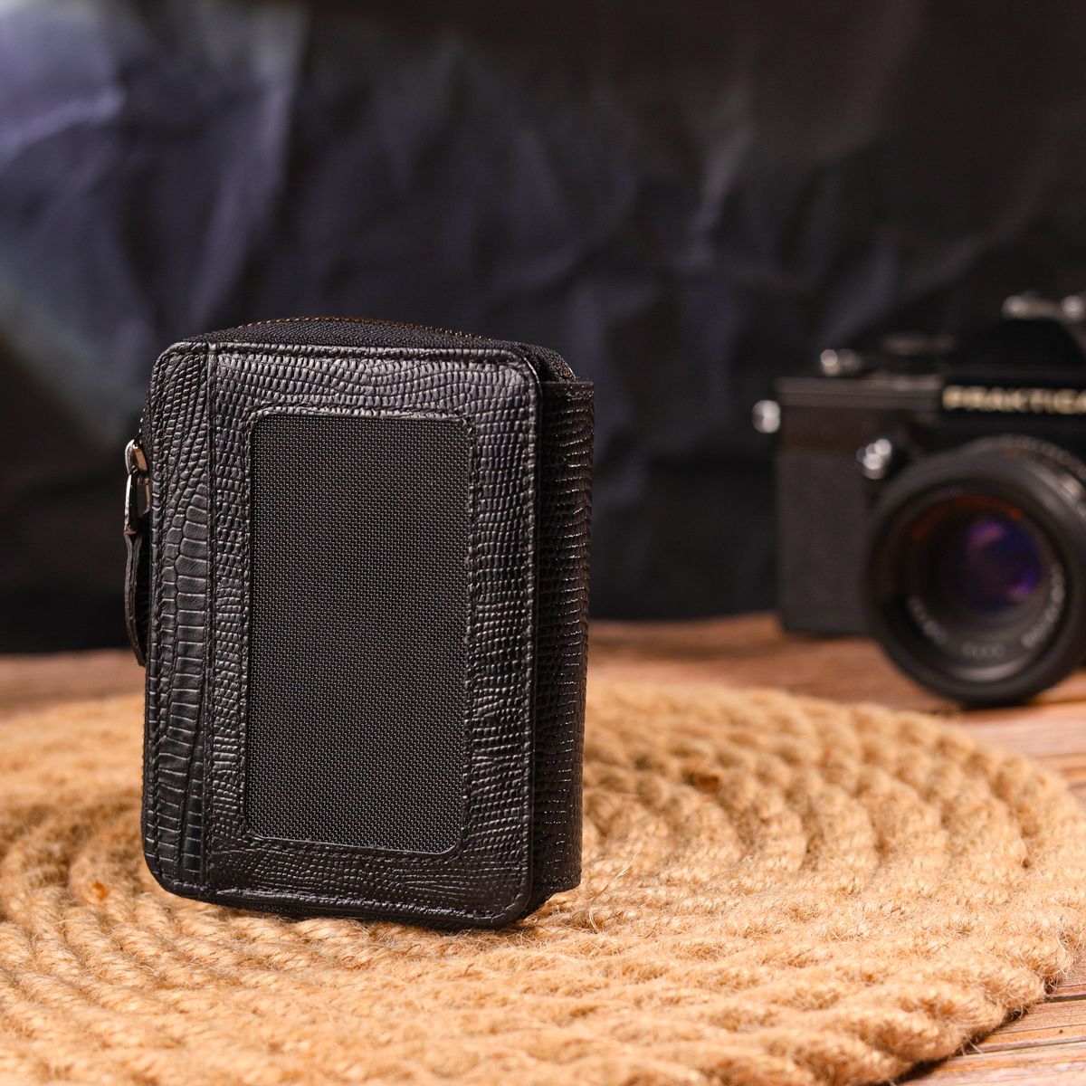Практичный кошелек для мужчин и женщин, из натуральной фактурной кожи, с тиснением под рептилию, в классическом черном цвете. Аксессуар имеет одно основное отделение, в которое помещаются купюры всех номиналов, одиннадцать карманов для карточек, один из которых под сеточкой, блок для карт с внешней стороны, а также карман для пропуска под сеточкой с лицевой стороны. Закрывается аксессуар на молнию, а блок для карточек хлястиком на кнопку. Цвет фурнитуры – темное серебро. Кожаный кошелек является удивительным подарком на все случаи жизни.