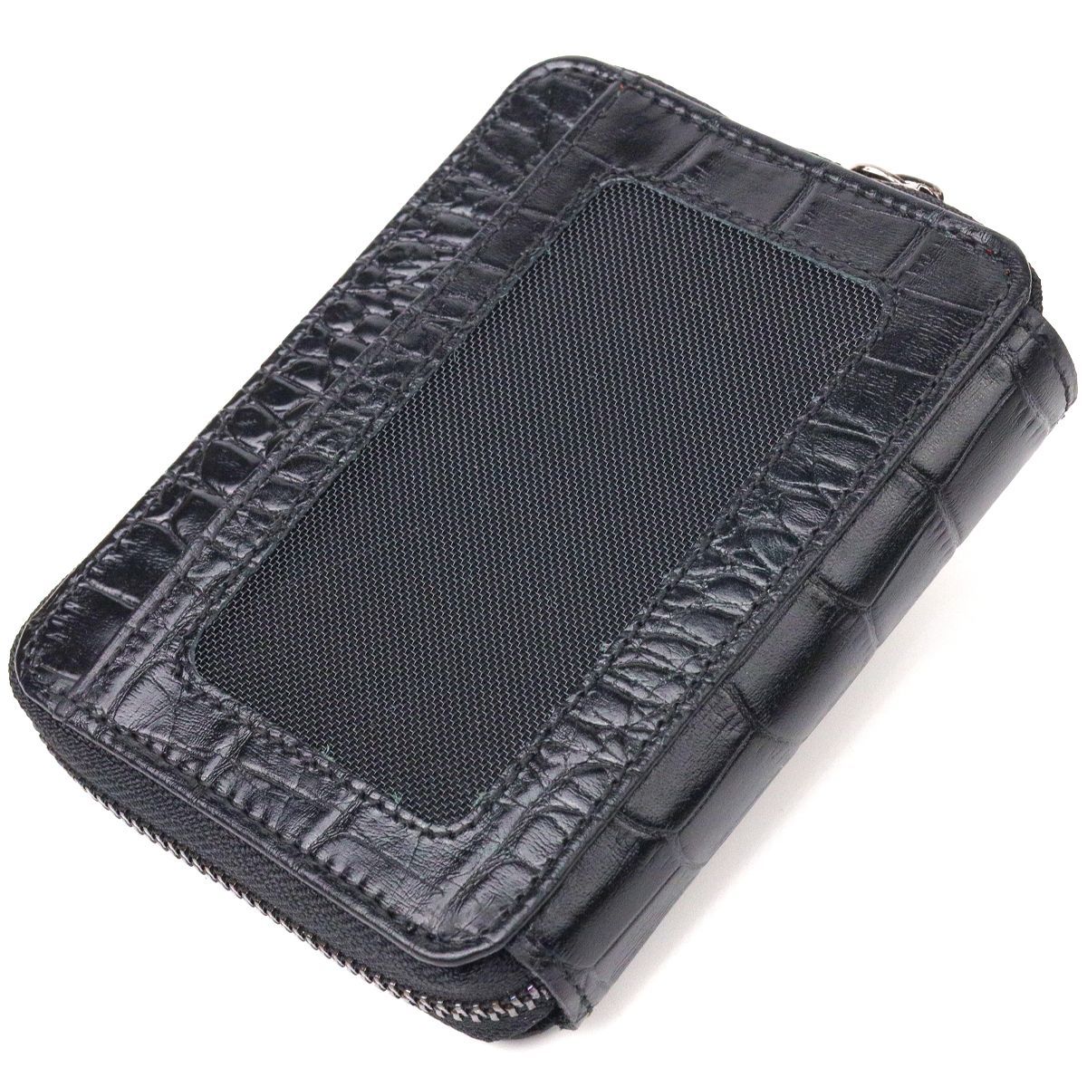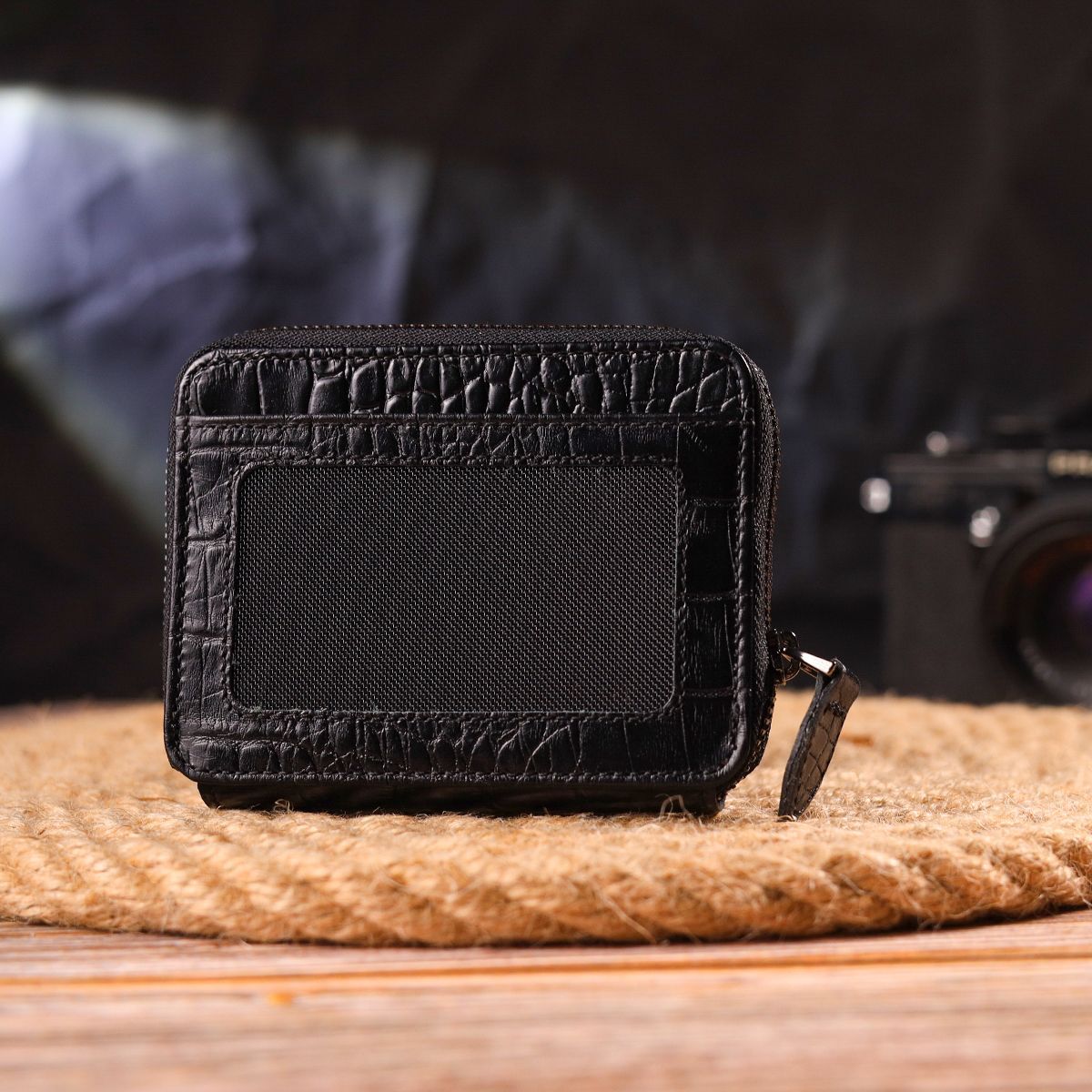 Интересный кошелек для женщин из натуральной фактурной кожи с тиснением под крокодила. Аксессуар имеет одно основное отделение, в которое помещаются купюры всех номиналов, одиннадцать карманов для карточек, один из которых под сеточкой, блок для карт с внешней стороны, а также карман для пропуска под сеточкой с лицевой стороны. Закрывается аксессуар на молнию, а блок для карточек хлястиком на кнопку. Цвет фурнитуры – темное серебро. Кожаный кошелек является удивительным подарком для жены, девушки, подруги.
