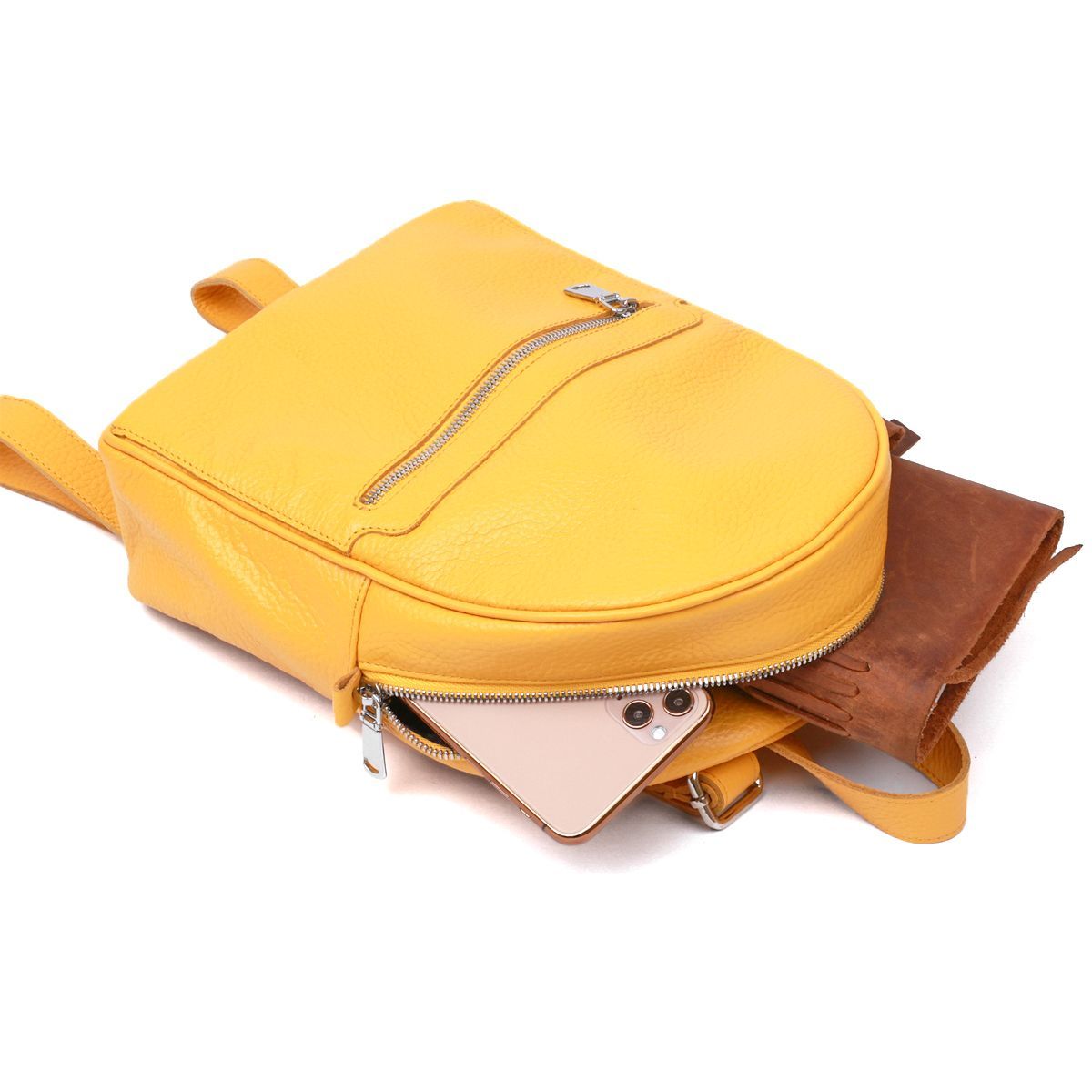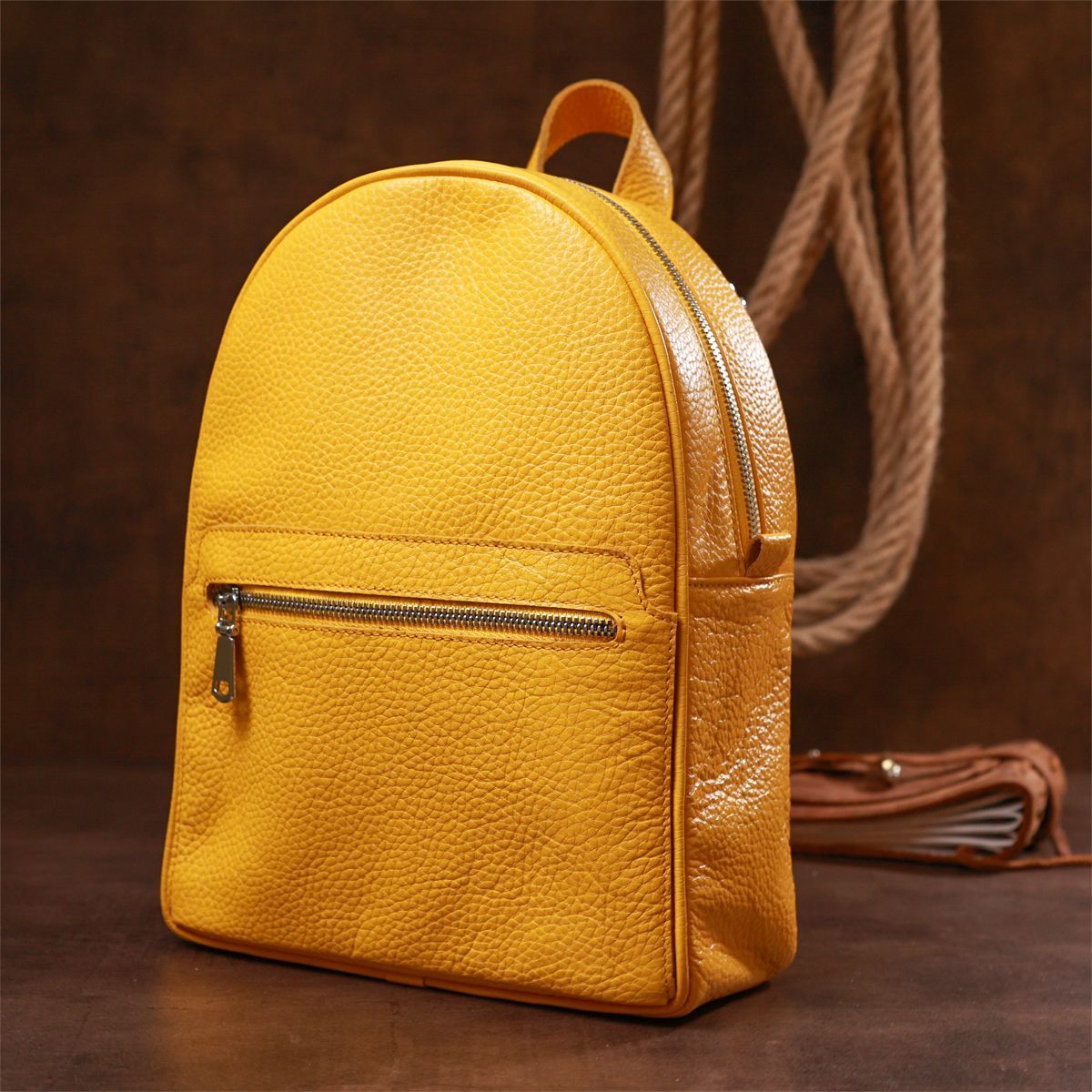 Практичный женский рюкзак небольшого размера в строгом привлекательном дизайне. Изготовлено изделие из натуральной кожи высокого класса и повышенной износостойкости. Цвет этой модели – сочный желтый, что выглядит очень красиво и по-летнему ярко. Внутреннее наполнение представлено в виде емкого основного отделения и нескольких карманов.