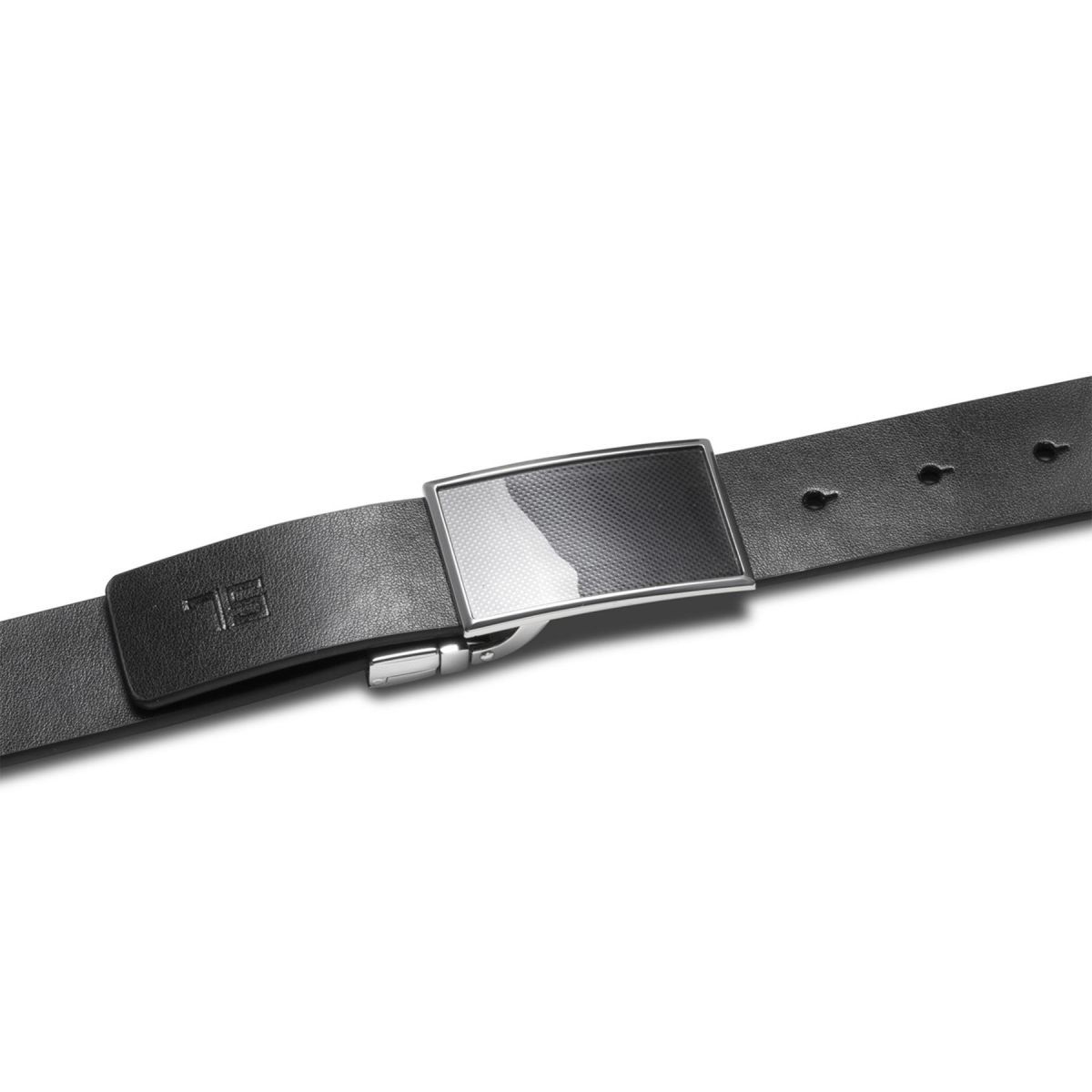 Ремінь обладнаний обертовою пластинчатою пряжкою (Plate Buckle), яка дозволяє моментально змінювати сторону. Пряжка виконана у стриманому сучасному стилі, з дзеркальною хромованою рамкою та контрастною вставкою. Вона має масивніший зовнішній вигляд у порівнянні з класичними пряжками і кріпиться в отворах на ремені за допомогою штифта, чим забезпечує більшу швидкість застібання і розтібання. Ширина ременя - 3.3 см, що робить його універсальним вибором для костюмних штанів, джинсів або чіносів.