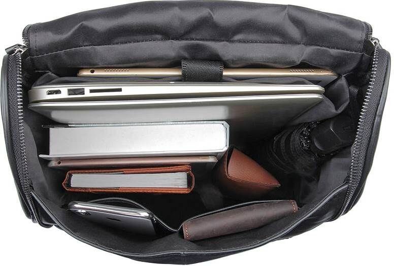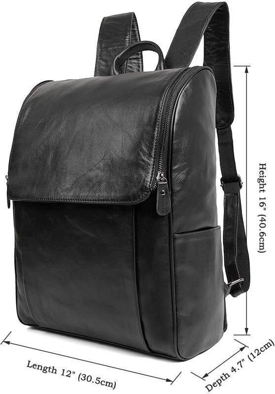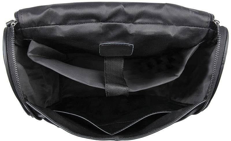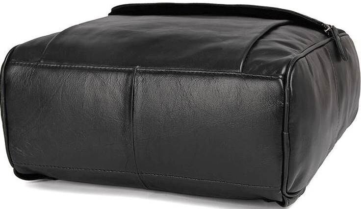 Вмісткий шкіряний рюкзак чорного кольору. Шкіра, з якої виготовлено виріб, має зернисту фактуру. Вона м'яка, приємна на дотик. Колір фурнітури: темне срібло. Підкладка даного аксесуару виконана з міцного текстильного матеріалу чорного кольору.