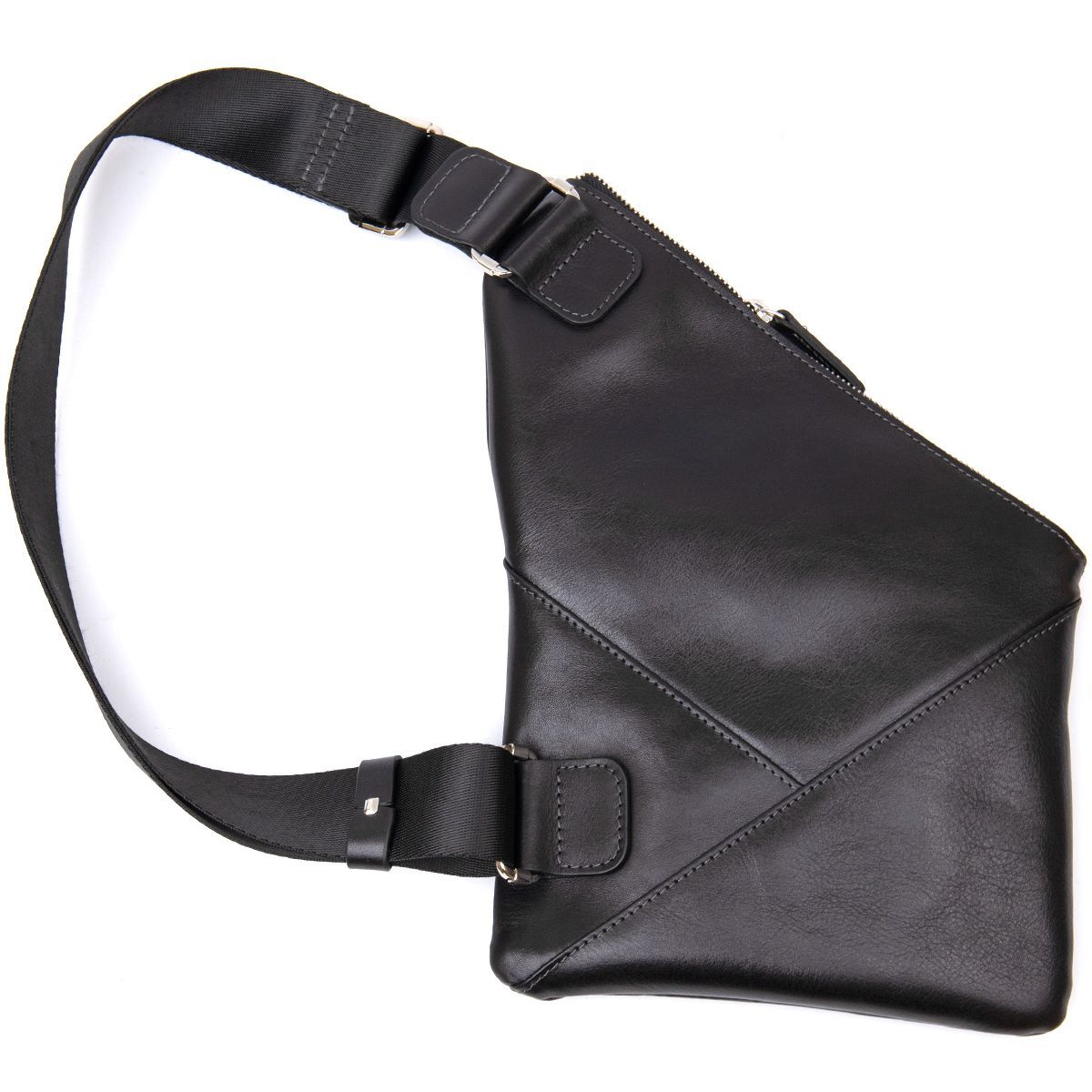 Интересная мужская сумка через плечо нестандартной формы, которая очень модна на сегодняшний день. Выполнена из крепкой и износостойкой натуральной кожи. Цвет черный, фактура гладкая и глянцевая. Ремень из крепкого текстиля, его можно регулировать по длине. Упакованная сумка в хороший чехол с ручками.