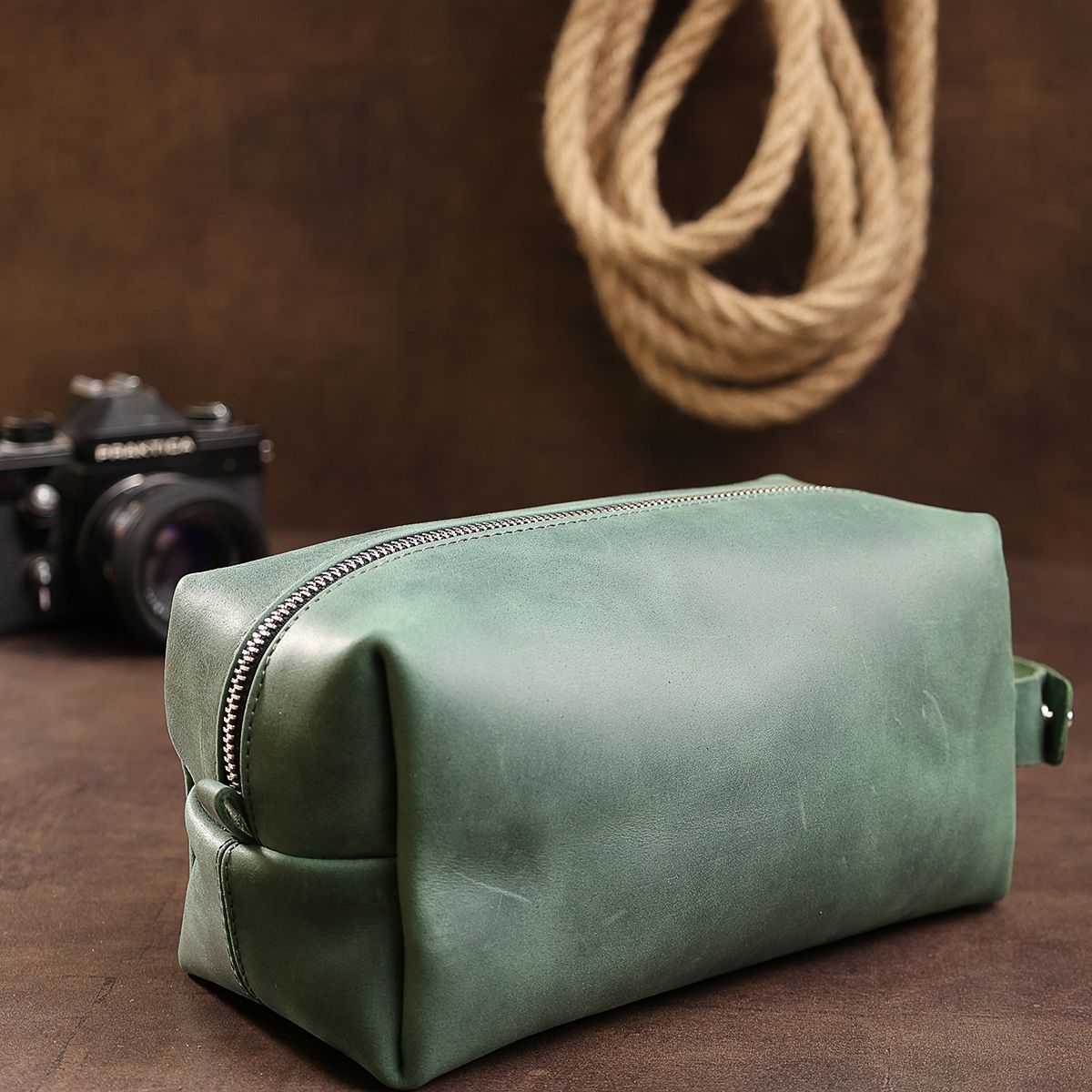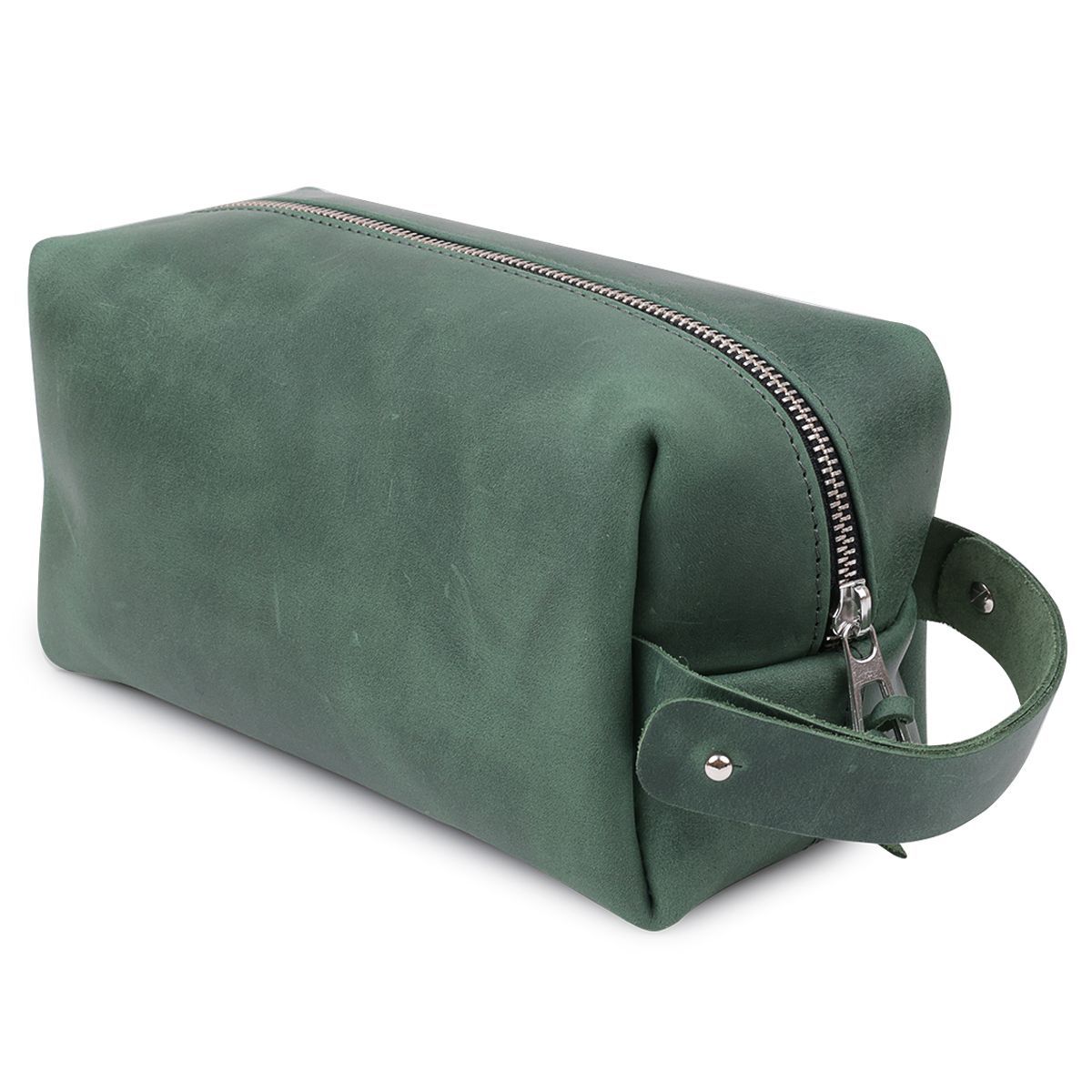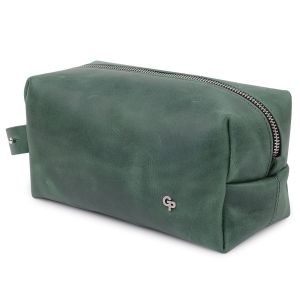 Универсальная косметичка из натуральной крепкой кожи высокого качества с отличными характеристиками. Имеет приятную на ощупь матовую винтажную фактуру и стильный зеленый цвет. Если нужно переносить косметичку в руках, то для этого предусмотрена боковая ручка. Упаковано изделие в фирменный чехол.