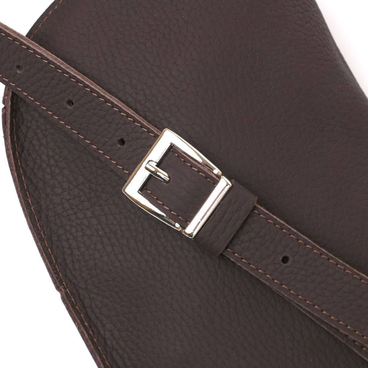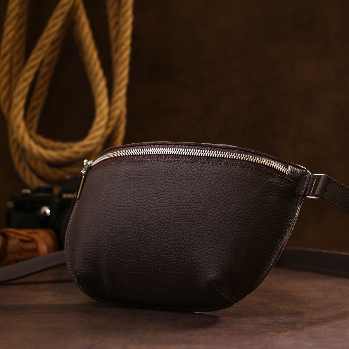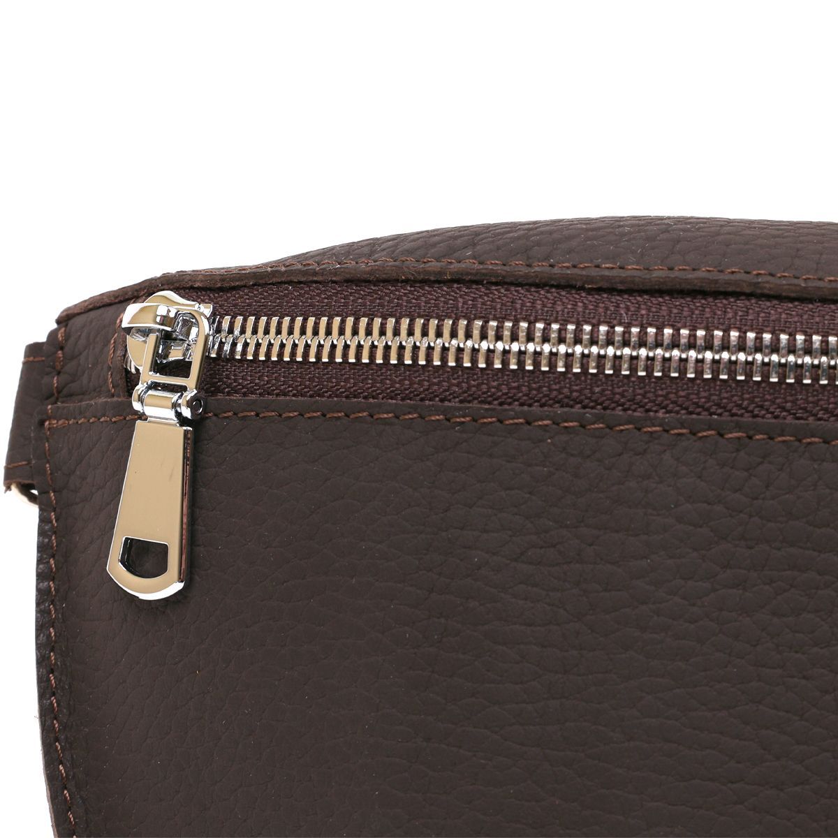 Великолепная женская бананка в коричневом матовом цвете, выглядящая очень стильно и красиво. Изготовлено изделие из натуральной кожи высокого качества и улучшенными прочностными показателями. Фактура – зернистая и очень приятная на ощупь. С такой сумкой можно и в путь, и на учебу, и работу. Ремень регулируется по длине и изготовлен из натуральной кожи.