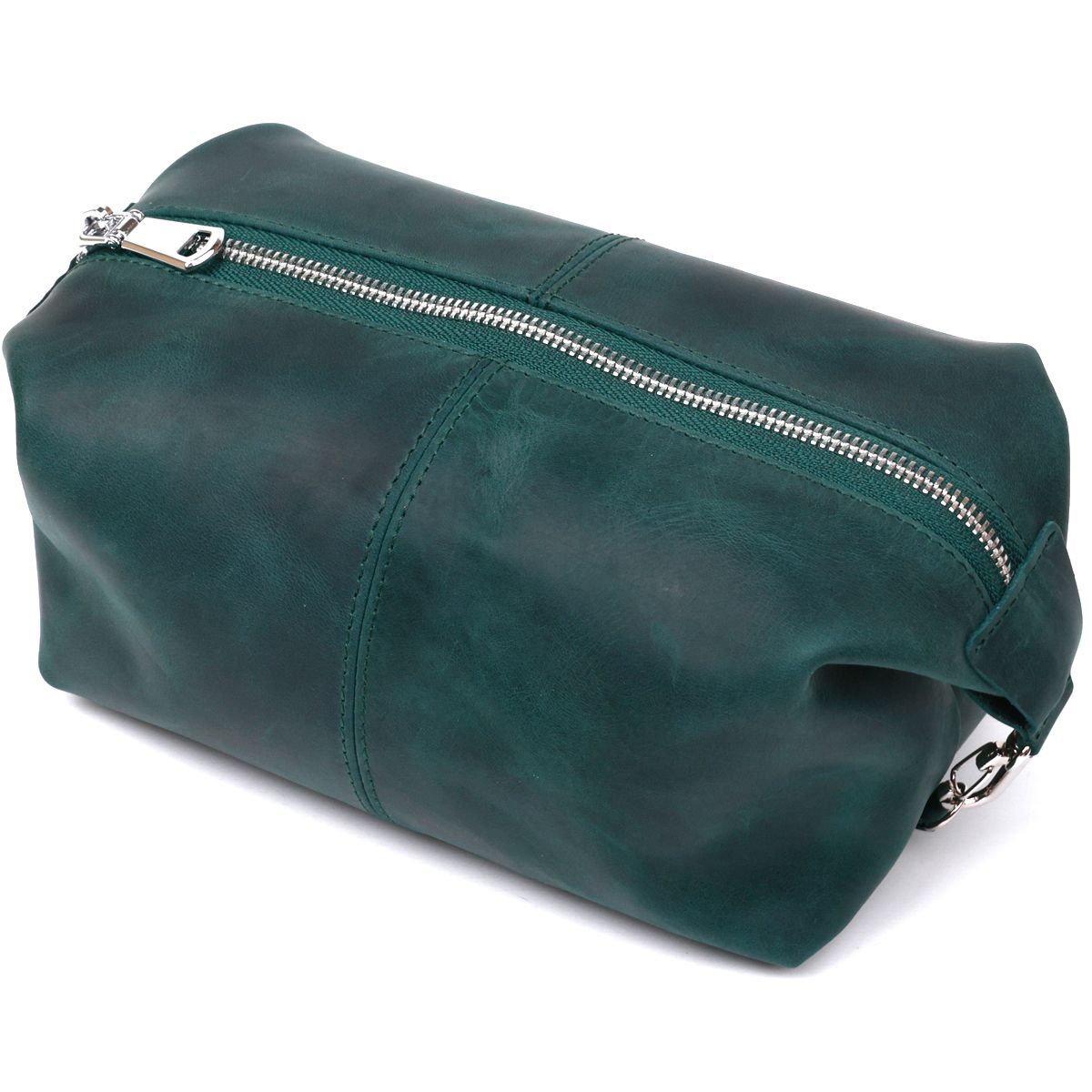 Добротная косметичка от украинского производителя, которую можно использовать для хранения негабаритных вещей, документов, косметики и т.п. Выполнен аксессуар из натуральной высококлассной кожи с отличными характеристиками. Цвет изделия – темно-зеленый, фактура – гладкая матовая с винтажными нотками.
