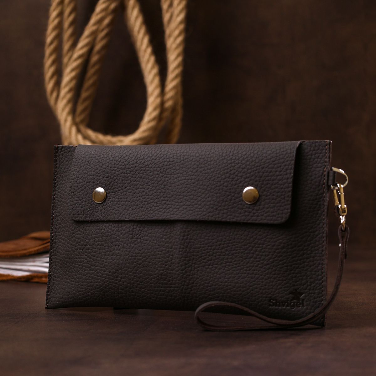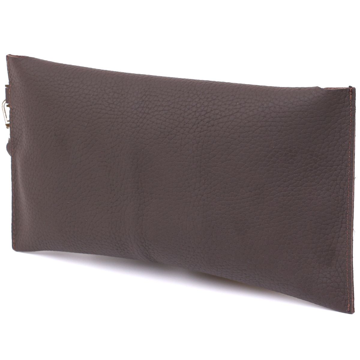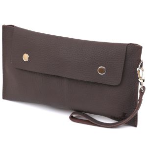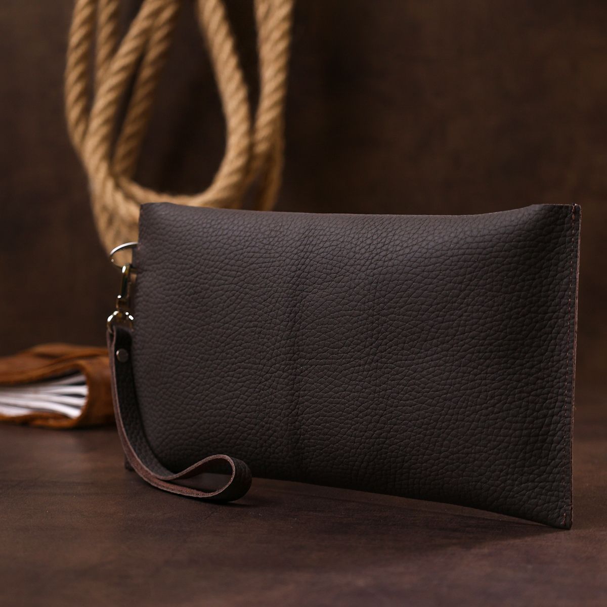Красивая и практичная тревел-косметичка из натуральной высококачественной кожи с высокими показателями стойкости к износу. Изделие выполнено в крупнозернистой фактуре, имеет темный коричневый цвет и матовую поверхность, что выглядит очень стильно. Закрывается аксессуар на клапан с двумя кнопками, также имеется съемный кожаный ремешок на запястье.