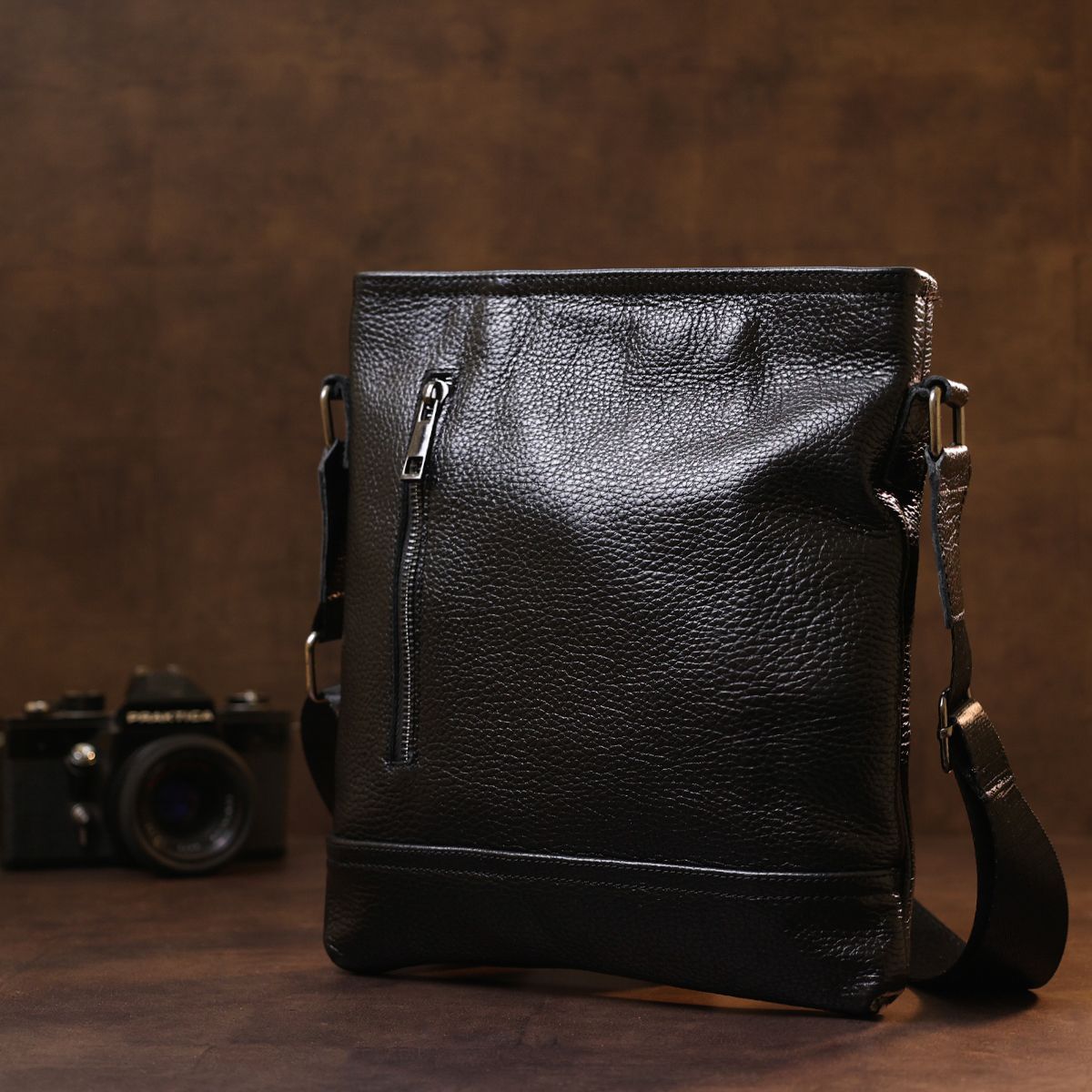 Стильная сумка для мужчин в черном универсальном цвете с зернистой фактурой. Материал изготовления – натуральная кожа высокого качества и высокой износостойкостью. Имеет вместительное отделение на молнии и два внешних кармана. Такая сумка украсит гардероб любого мужчины.