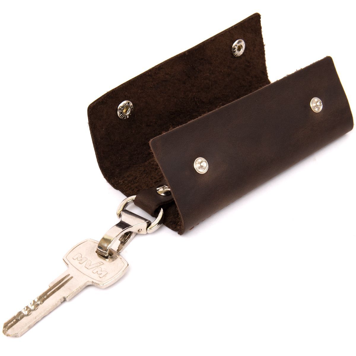 Универсальная винтажная ключница из натуральной кожи высокого качества. Закрывается на две металлические кнопки, что очень удобно и практично. Цвет фурнитуры – серебро. Выглядит стильно и дорого. Упаковка представлена в виде фирменного чехла.