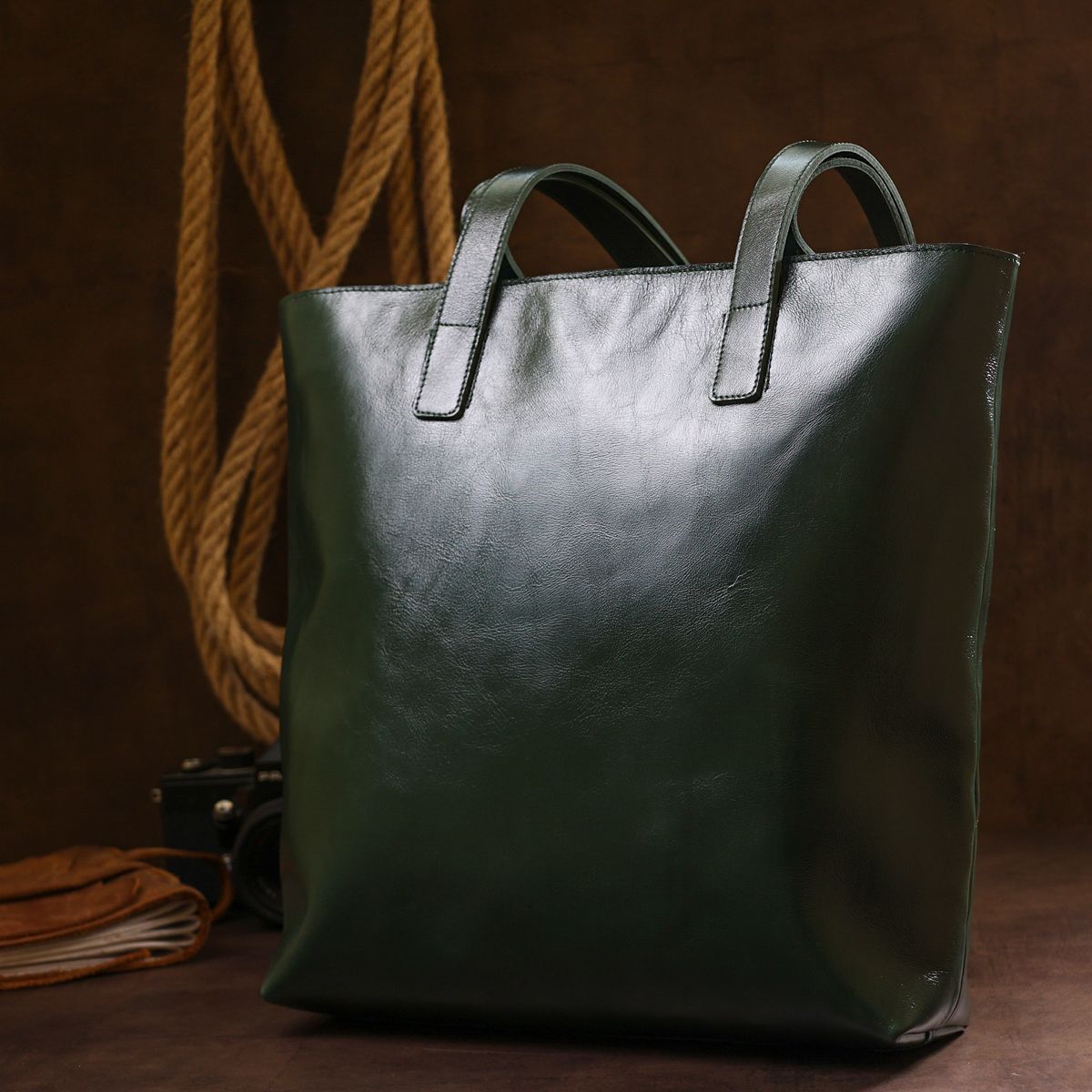 Великолепная женская сумка-шоппер для современных деловых дам. Выполнена она из натуральной кожи, высокое качество которой видно даже невооруженным глазом. Цвет изделия – зеленый с легким блеском, что очень модно в этом сезоне. Фактура – гладкая и приятная на ощупь. Закрывается сумка на молнию. Для переноски предусмотрены две прочные кожаные ручки.