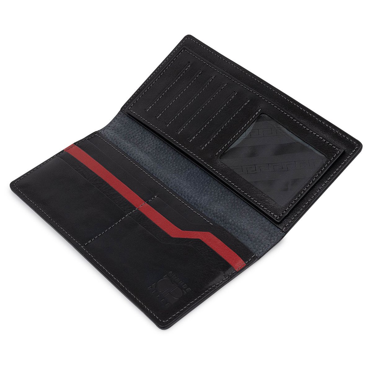 Необычный портмоне унисекс в черном глянцевом цвете. Выполнено оно из высококачественной натуральной кожи. Внутри есть вместительные отделения для купюр, четырнадцать карманчиков для разных карт и визиток, а также один карман – прозрачный для фото или др.