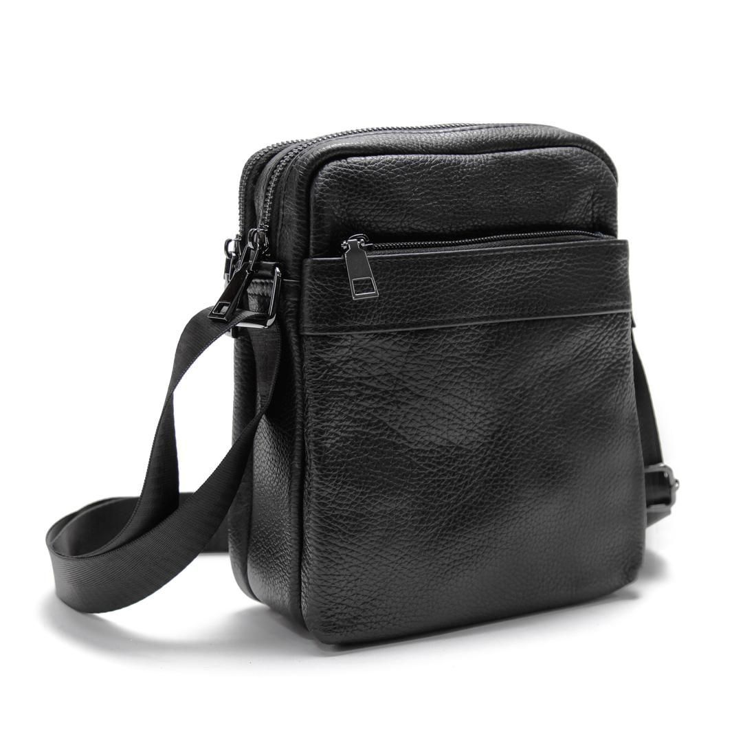 Сумка через плече Tiding Bag M56-2001A із натуральної шкіри у чорному кольорі, зернистої фактури. Розмір: 19 x 5 x 23см. Модель одна з найзручніших і практичніших, оскільки має багато відділень і дозволяє комфортно розмістити всі речі. У сумці два основних відділи на блискавках, з невеликою потайною кишенькою всередині. З лицьових зовнішньої та тильної сторін є додаткові кишені на змійках. Месенджер має довгий текстильний ремінець, з регулятором довжини. Підкладка: текстиль. Колір чорний. Колір фурнітури: темне срібло.